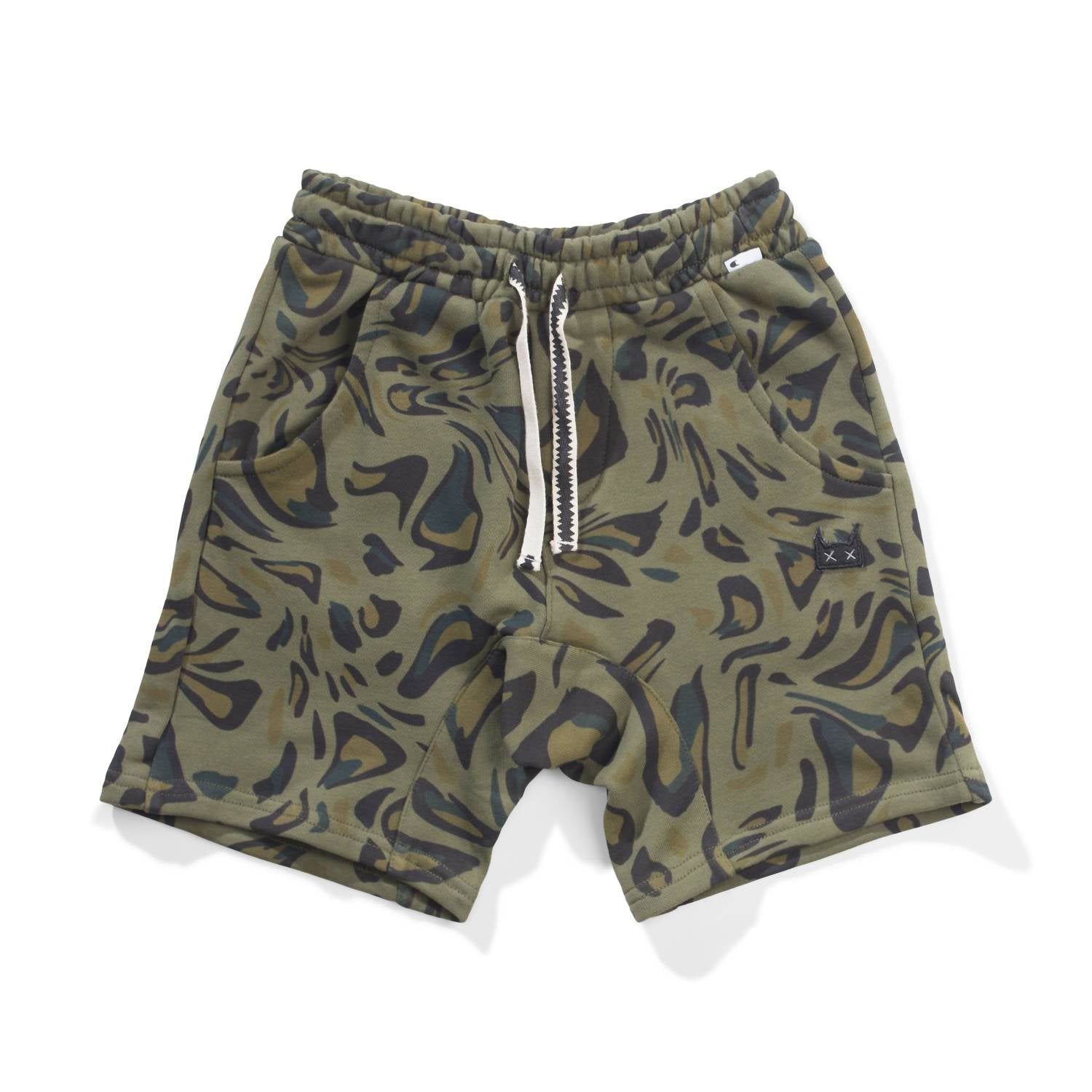 Unleash your style with the Catslide Short by MUNSTERKIDS, a statement piece for your summer wardrobe. These mid-rise, midweight shorts boast 100% cotton composition in a striking olive green printed design that stands out. Featuring an elastic pull-on waistband with drawstring and practical curved front pocket and rea