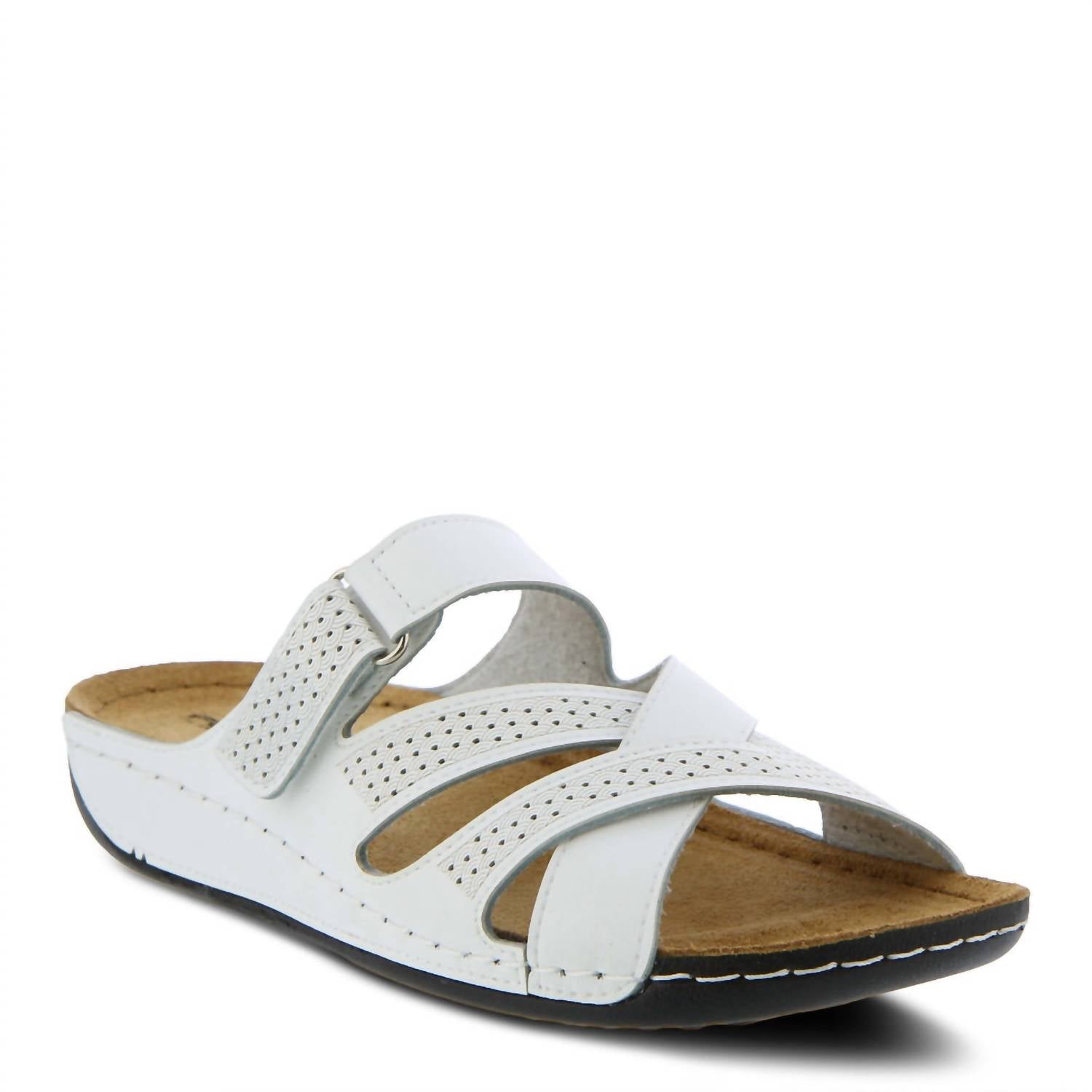 Classicly cute and all-day-wearable. We love this sandal. This chic slide sandal with multiple straps offers adjustable hook-and-loop closures for a customized, secure fit. Geometric perforations give it a contemporary flair, while the padded insole and cushioned footbed provide all-day comfort.