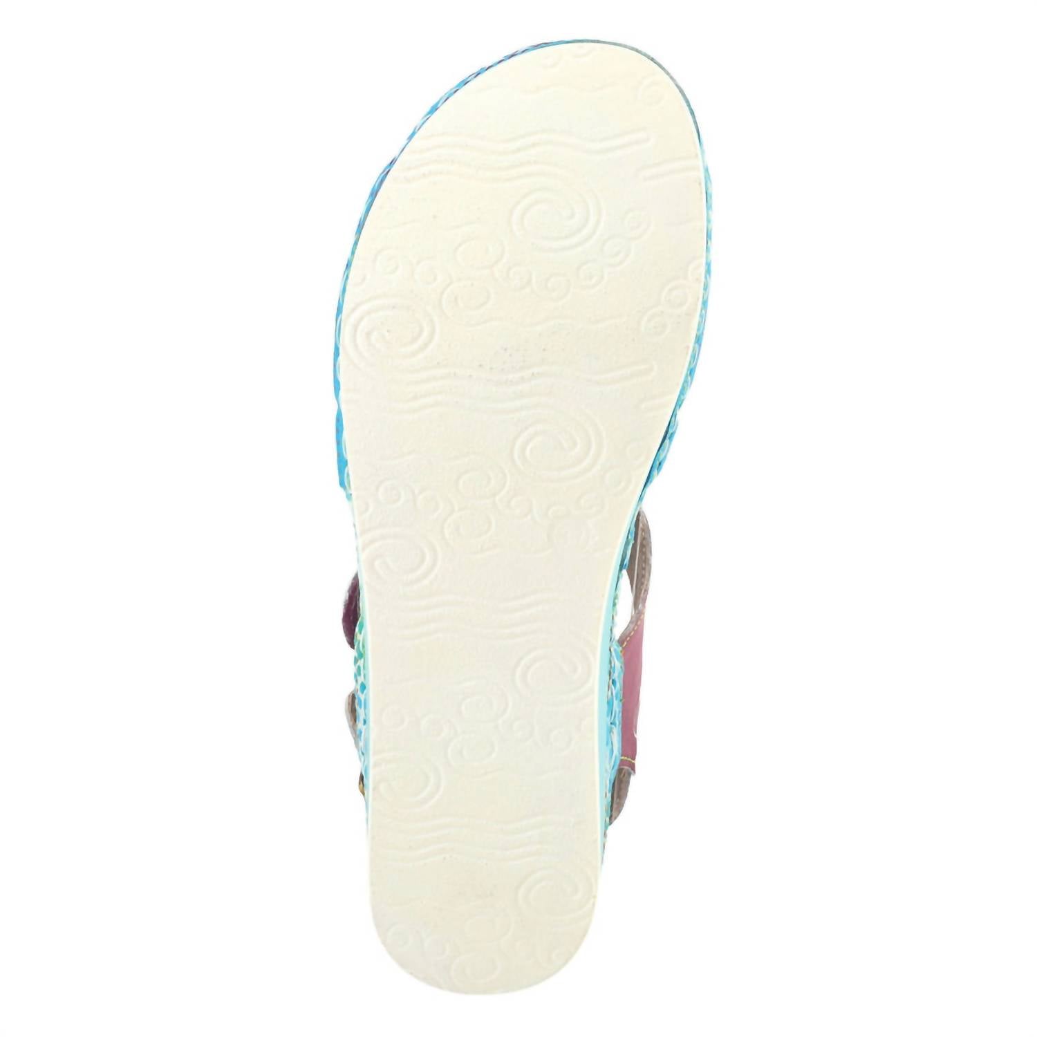 Hand-painted leather. Contrast stitch detailing. Antiqued gold hardware. Floral embossed design. Leather pieced wedge. Hook-and-loop adjustable straps and an adjustable buckled strap at the heel. Synthetic leather lining. Synthetic leather padded insole. Polyurethane outsole.