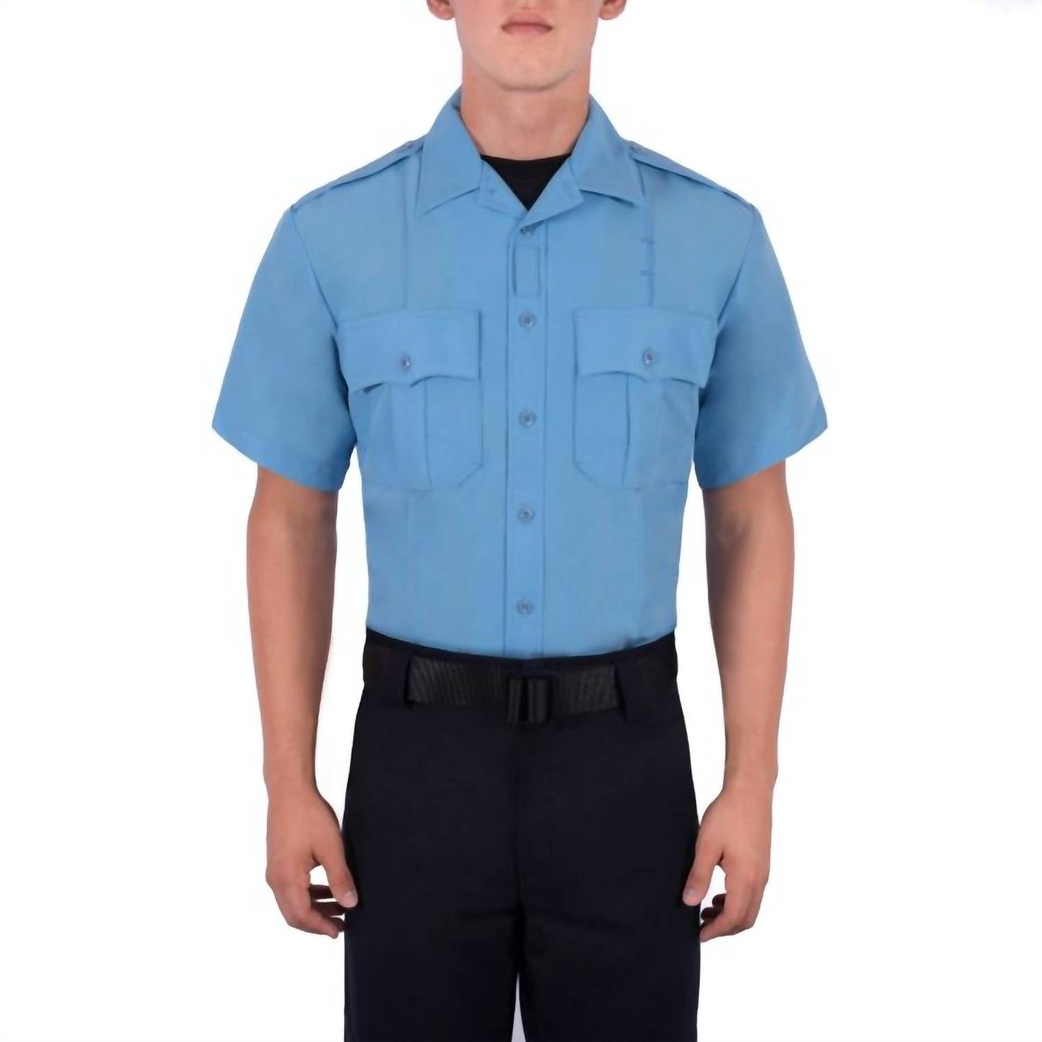 Introducing the Blauer Short Sleeve Polyester Supershirt® in a sophisticated Medium Blue, perfect for any man's workwear wardrobe. This shirt is crafted from an 8 oz. washable 100% fade-resistant polyester with a 10% stretch and wicking finish, enhanced by stretch nylon mesh side panels for superior breathability and a