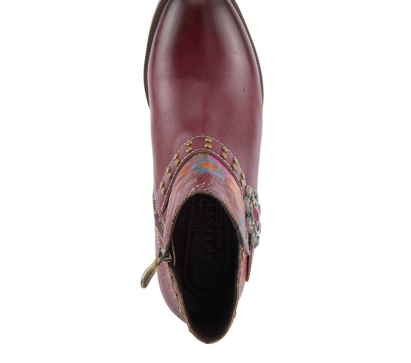Step into style with the Women's L'Artiste Dainty Lady Floral Prairie Boot by Spring Step Shoes, a perfect blend of elegance and western flair. Crafted from luxurious leather, these Bordeaux Multi boots feature hand-painted floral embossing and a studded belt with antique brass embellishments. They boast a mid-height western heel at 2 1/4 inches, with a 6-inch shaft and a 10 1/2-inch circumference, providing both height and stability. Easily slip into these boots with their convenient zipper closure, and enjoy their true-to-size fit while embracing your inner cowgirl.