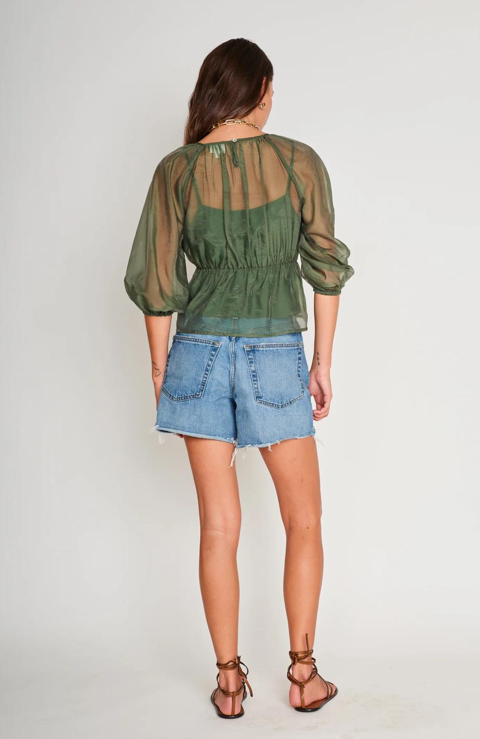 Pair this with your favorite jeans and slides for your next girls night out. Elevate your wardrobe with the Ella Top by dRA Los Angeles, featuring elegant three-quarter raglan puff sleeves and a flattering peplum silhouette. The textured Green organza brings sophistication to your look, making it perfect for a cocktail