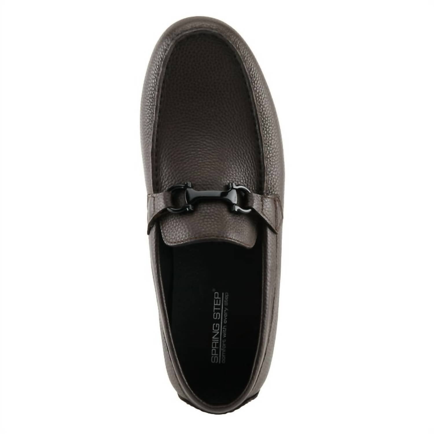 Introducing the Men's Jarrett Loafers by SPRING STEP SHOES, a sophisticated choice in rich brown for the modern man. Crafted from full-grain soft milled leather, these loafers feature a round toe and a hand-stitched moccasin style apron. The interior boasts a soft leather and textile lining, with a removable leather-co