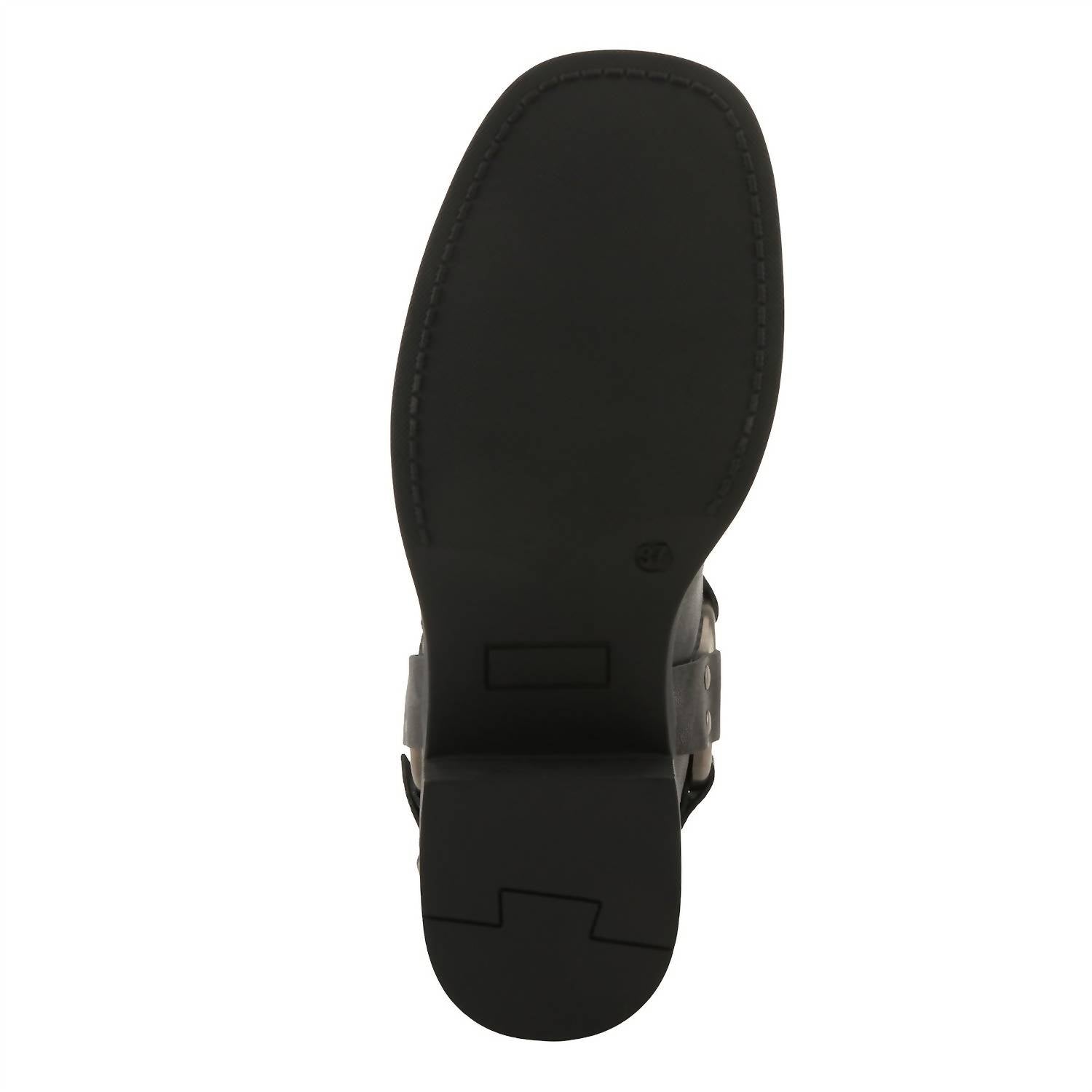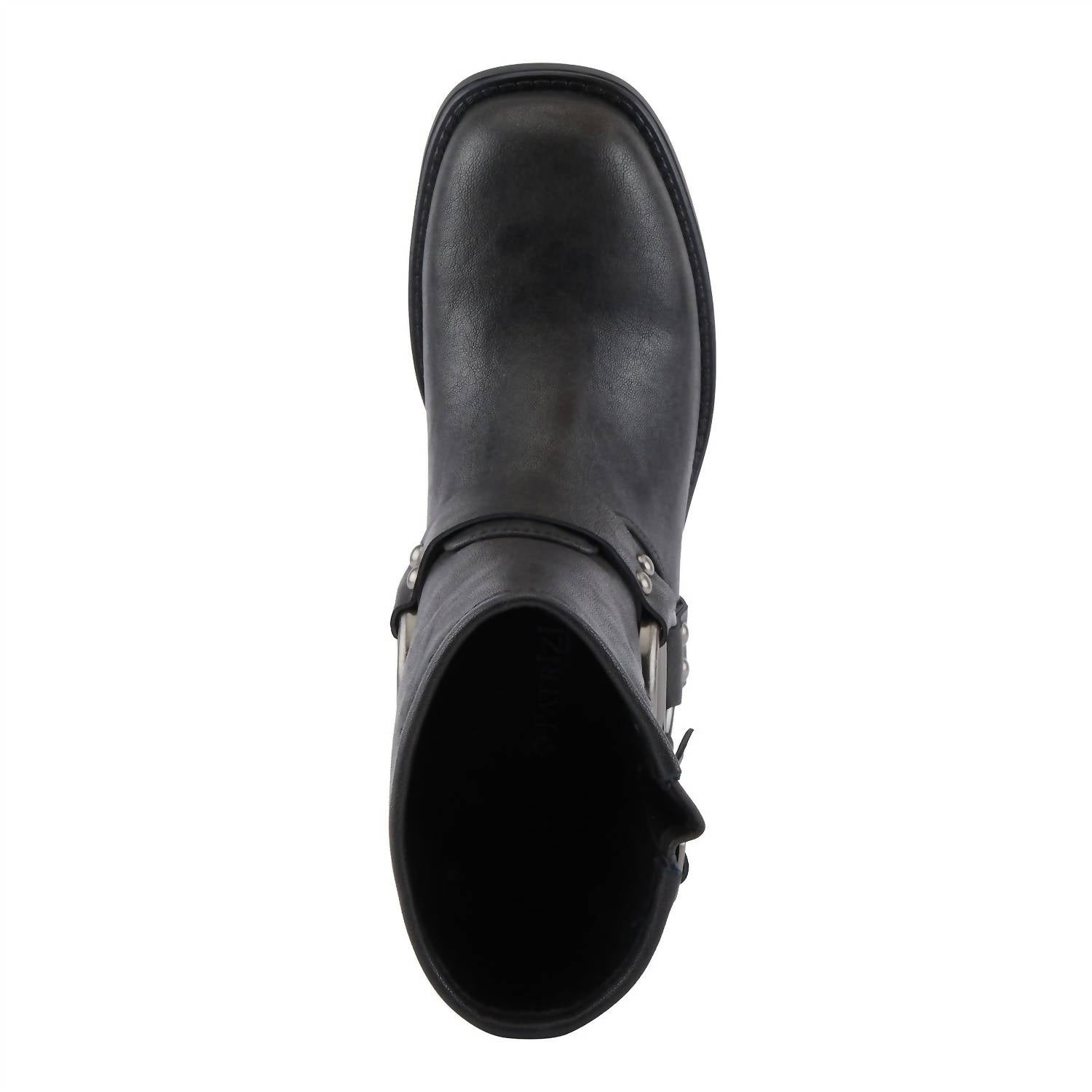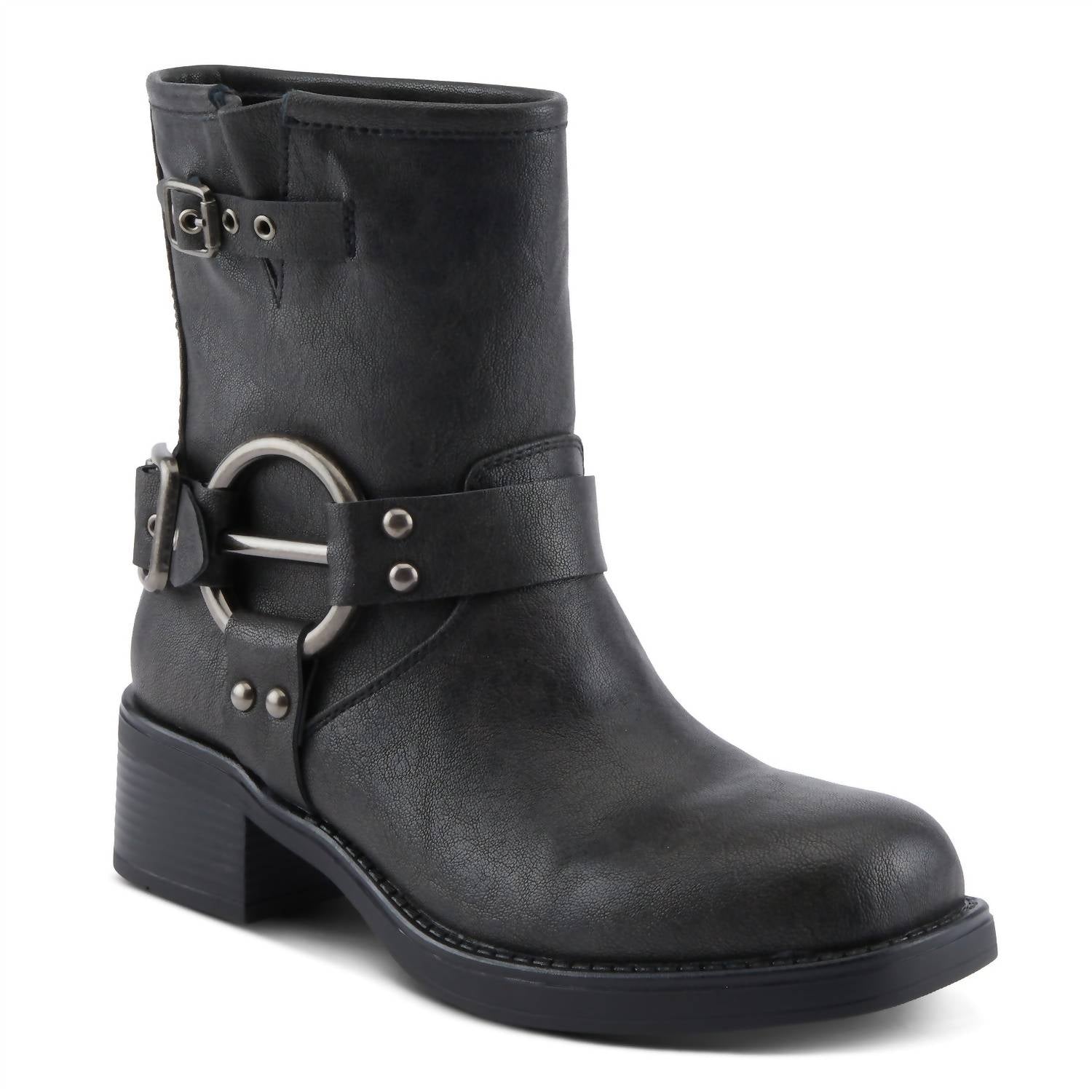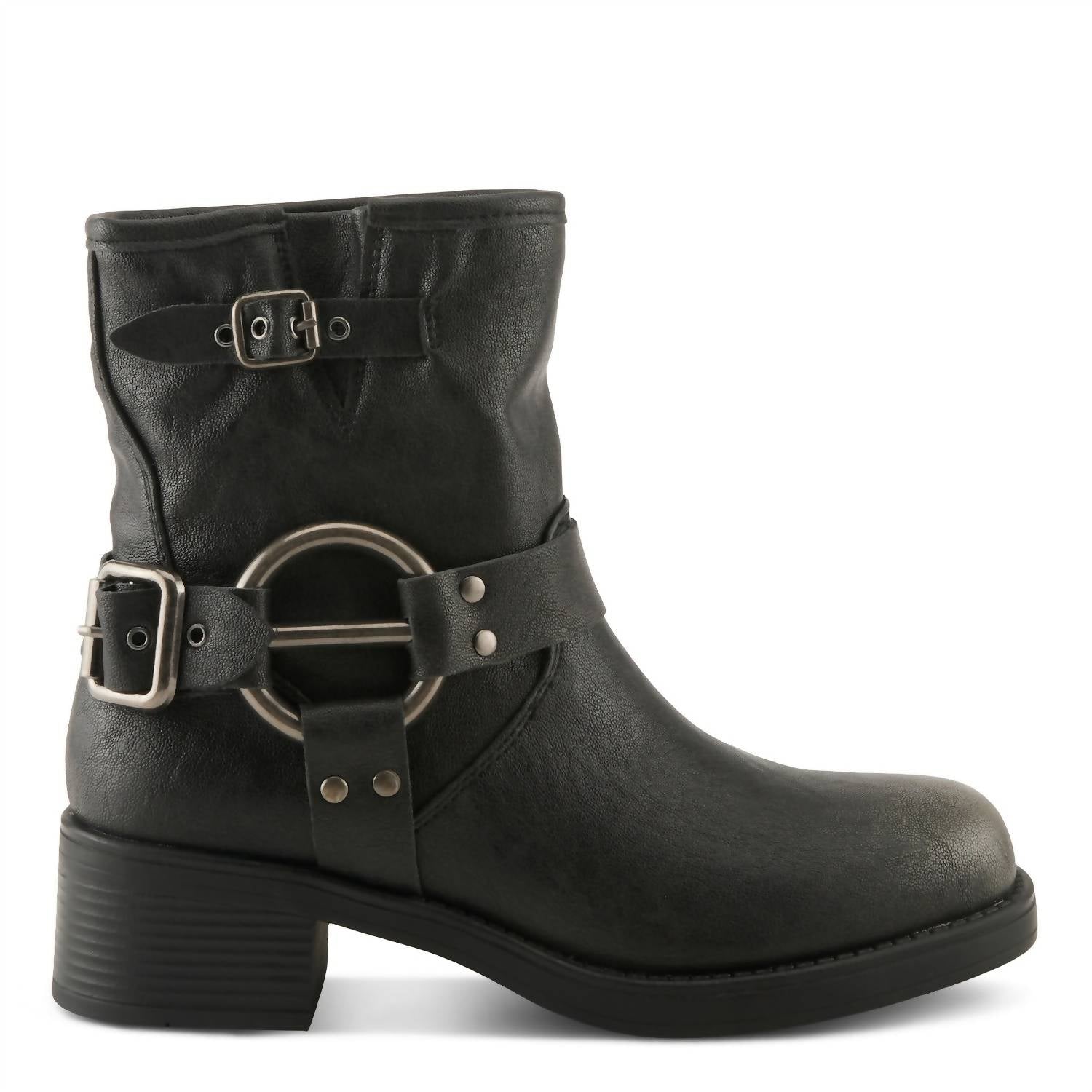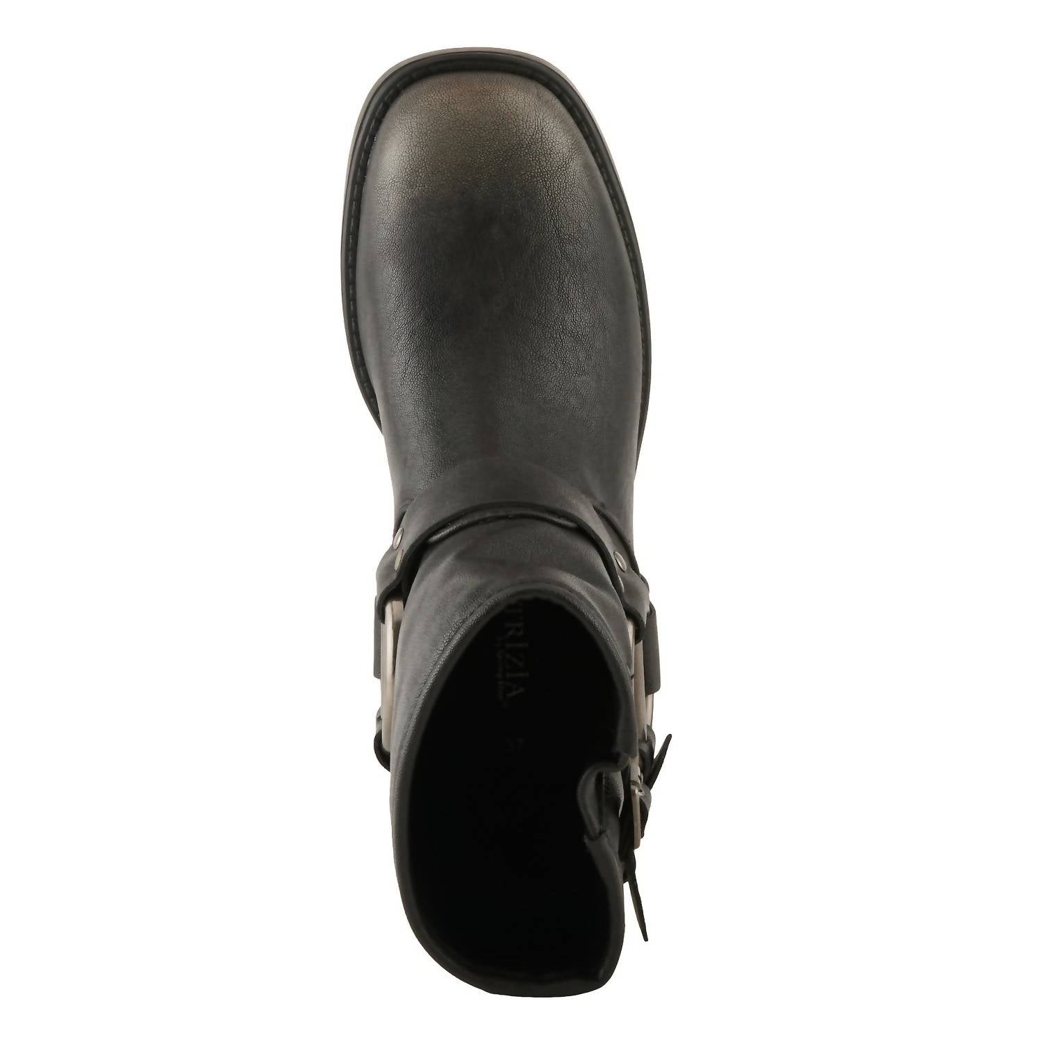 Step into bold style with the Women's L'artiste Patrizia Olwen Buckled-up Moto Boot by Spring Step Shoes. These charcoal ankle boots, crafted from faux leather, boast a motorbike-inspired aesthetic with decorative straps and an O-ring harness. Featuring an inner zipper closure for easy access, they include a 1 3/4" heel, a 1/2" platform, and a shaft height of 7 1/2" with a circumference ranging from 11" to 11 1/2". The boots are fitted with a durable TPR outsole and are adorned with velvet lining for a touch of comfort.