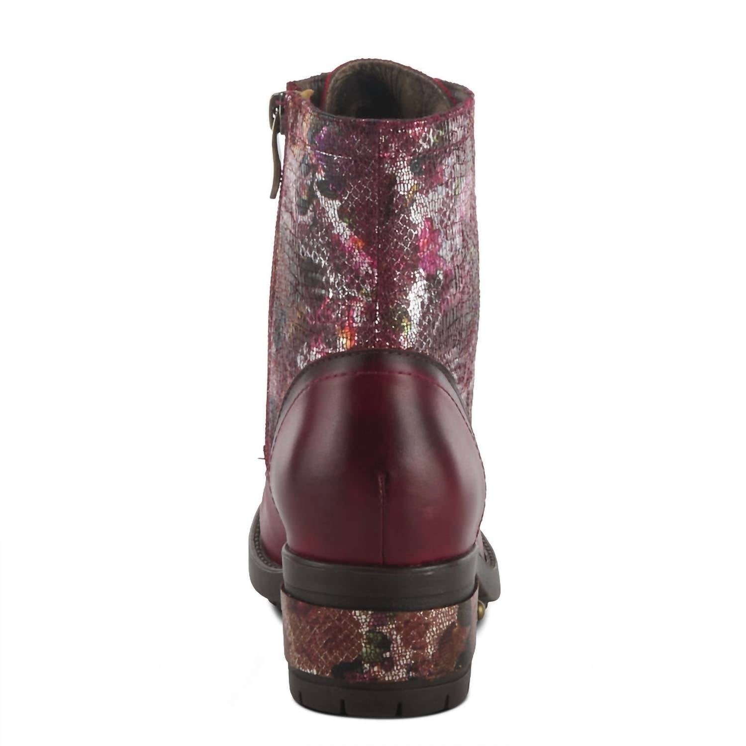 Featuring a metallic faux snakeskin and floral print in a vibrant Bordeaux Multi hue, this boot offers an eye-catching embossed pattern that extends through the heel, ensuring a cohesive aesthetic. A convenient zipper closure provides a secure fit, and the sleek design is elevated by a 1.75" heel, striking the perfect balance between comfort and fashion. Made for the modern woman who appreciates both texture and playful design.
