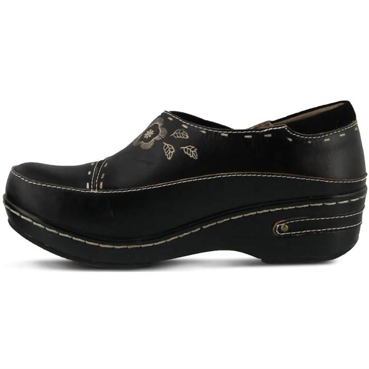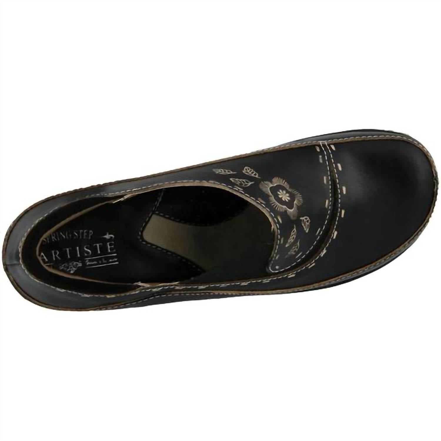 Hand-painted, closed-back leather clog combines comfort with artistic detail. Featuring a round toe, contrast embossed floral design, and elastic side inlay for a flexible fit, it’s finished with contrast stitching and a leather-pieced heel for added character. The interior includes a synthetic leather lining and a padded insole made from synthetic leather and textile for cushioned support. Set on a durable polyurethane outsole with a 2" heel, this clog offers both style and stability for all-day wear.