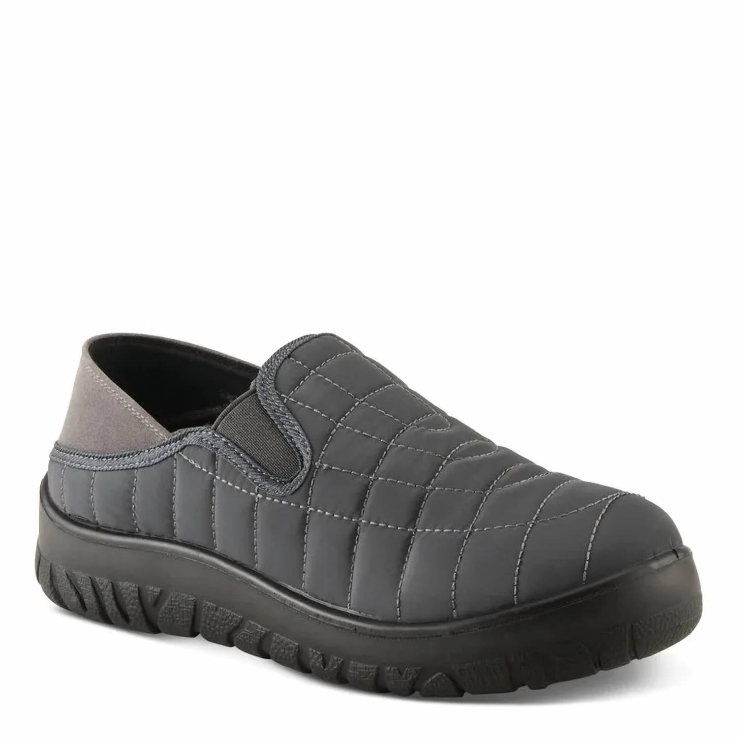 Rainboots so cute, you'll want to wear these even on the lightest drizzle days. 2-in-1 shoe featuring beautiful quilting design, collapsible heel back, and a snow grip clip on the heel with warm faux-fur lining on an all-day comfortable outsole. Upper: Nylon Lining: Faux Fur Insole: Faux Fur Outsole: Polyurethane Heel