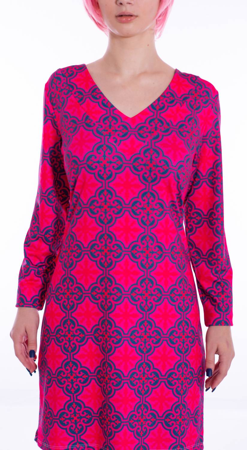 Introducing the Ashley Mini Dress by Michelle Parisou, a vibrant piece designed to brighten your wardrobe. Featuring three-quarter sleeves and a flattering V-neckline, this hot pink dress showcases a playful navy blue lattice print with delicate snowflake patterns. Its A-line silhouette and pull-on closure make it perfect for holiday parties or festive gatherings. The dress combines sophistication with a joyful splash of color.