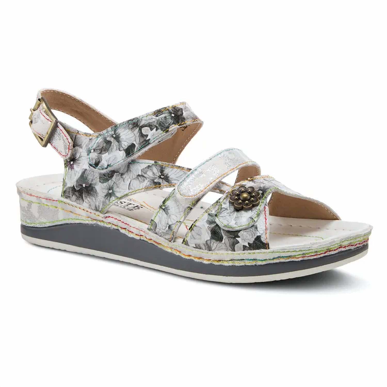 Flowy dresses, cropped pants, and even jumpsuits... this sandal works with them all! French inspired design, hand painted leather sandal featuring unique color blocking and fashioned with a metal flower button. Heel Height (approximately): 1 1/2", Platform Height: 1" Hand painted leather, contrast stitch detailing, ant