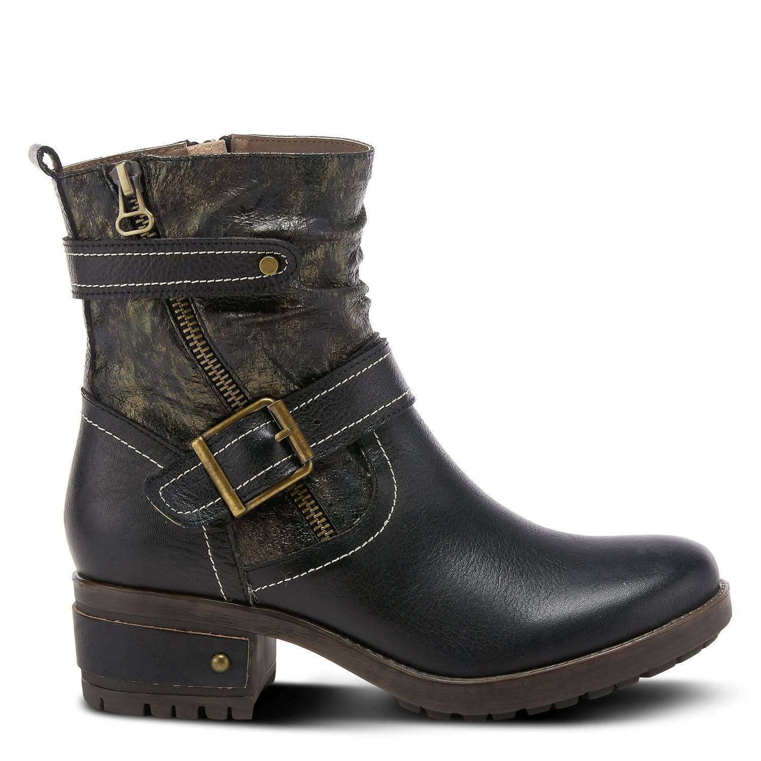 Elevate your footwear collection with the Women's Frankie Side Zip Bootie by SPRING STEP SHOES in a chic Black Combo. Expertly crafted with a leather and textile upper, this bootie features a decorative zipper, an ankle strap, and a top strap on a comfort lug sole. Lining and insole are made of durable synthetic materials, while the rubber outsole provides stability. Closure: Side zipper, with a block heel height of 2 inches and a platform height of 3/4 inch, offering a stylish yet comfortable low-heel experience.