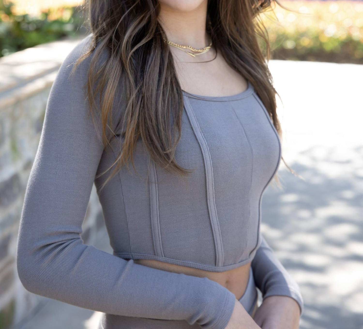 Crafted by Kaveah, the Girls' Ribbed Long Sleeve Corset Top in dark truffle offers a flattering fit with its corset style and fitted body. The square neckline and long sleeves add elegance, while the cropped length is perfect for pairing with oversized joggers. Made from 96% Rayon and 4% Spandex, this pullover design is proudly made in the U.S.A. Care instructions include machine washing cold and laying flat to dry, with an option to cool iron. This trendy monochrome piece is ideal for vacation or Valentine's Day outings.