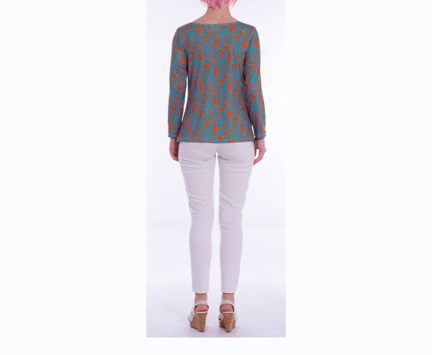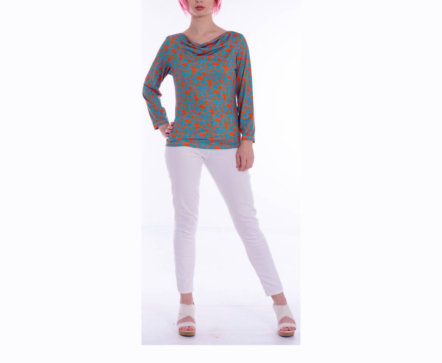 A long sleeve top you can wear with denim, skirts, well... just about anything! Discover the Talia Long Straight Sleeves Top by Michelle Parisou, a vibrant choice for those seeking style and comfort. Featuring a relaxed cowl neckline, this long-sleeve top is patterned with whimsical orange vines that create a striking
