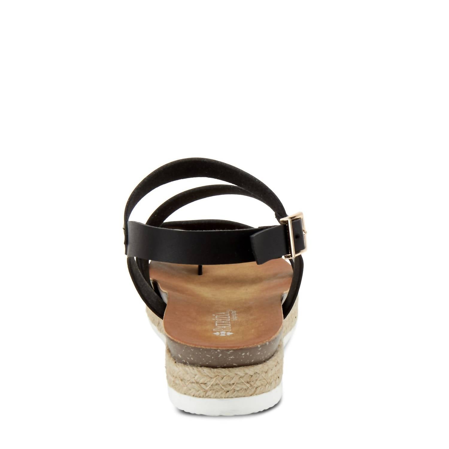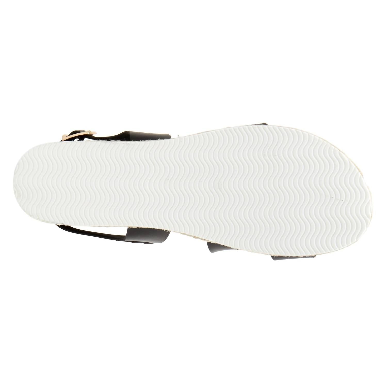 Non-leather asymmetrical sandal featuring a dainty and beautiful wide band design and an adjustable buckle ankle strap all on a low comfort flat. Open Toe/Round Toe. Jute-wrapped comfort Flat. Synthetic Lining. Synthetic Insole. PU Outsole. Buckle Closure. Heel Height (approximately): 1 1/4". Platform Height (approximately): 1"