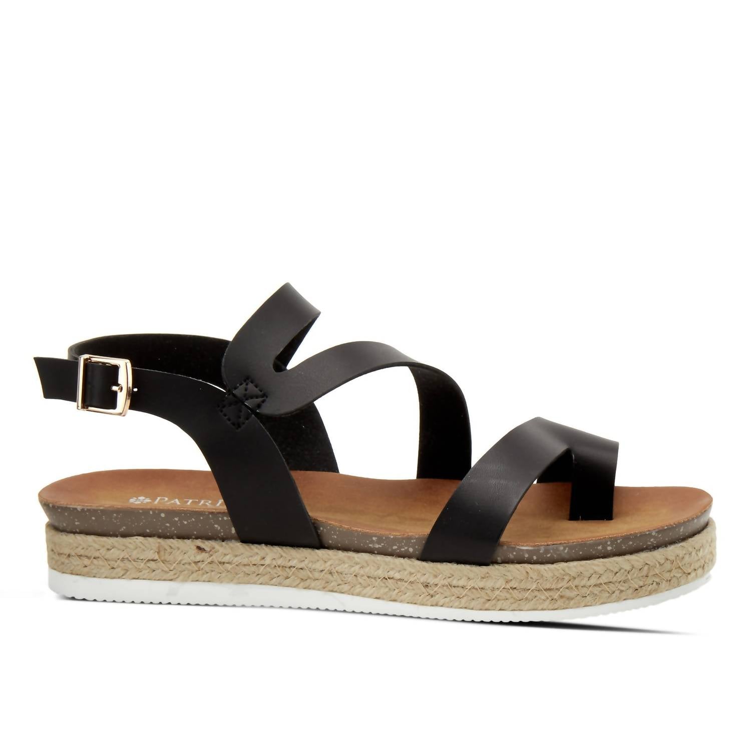 Flowy dresses, cropped pants, and even jumpsuits... this sandal works with them all! Non-leather asymmetrical sandal featuring a dainty and beautiful wide band design and an adjustable buckle ankle strap all on a low comfort flat. Open Toe/Round Toe. Jute-wrapped comfort Flat. Synthetic Lining. Synthetic Insole. PU Out