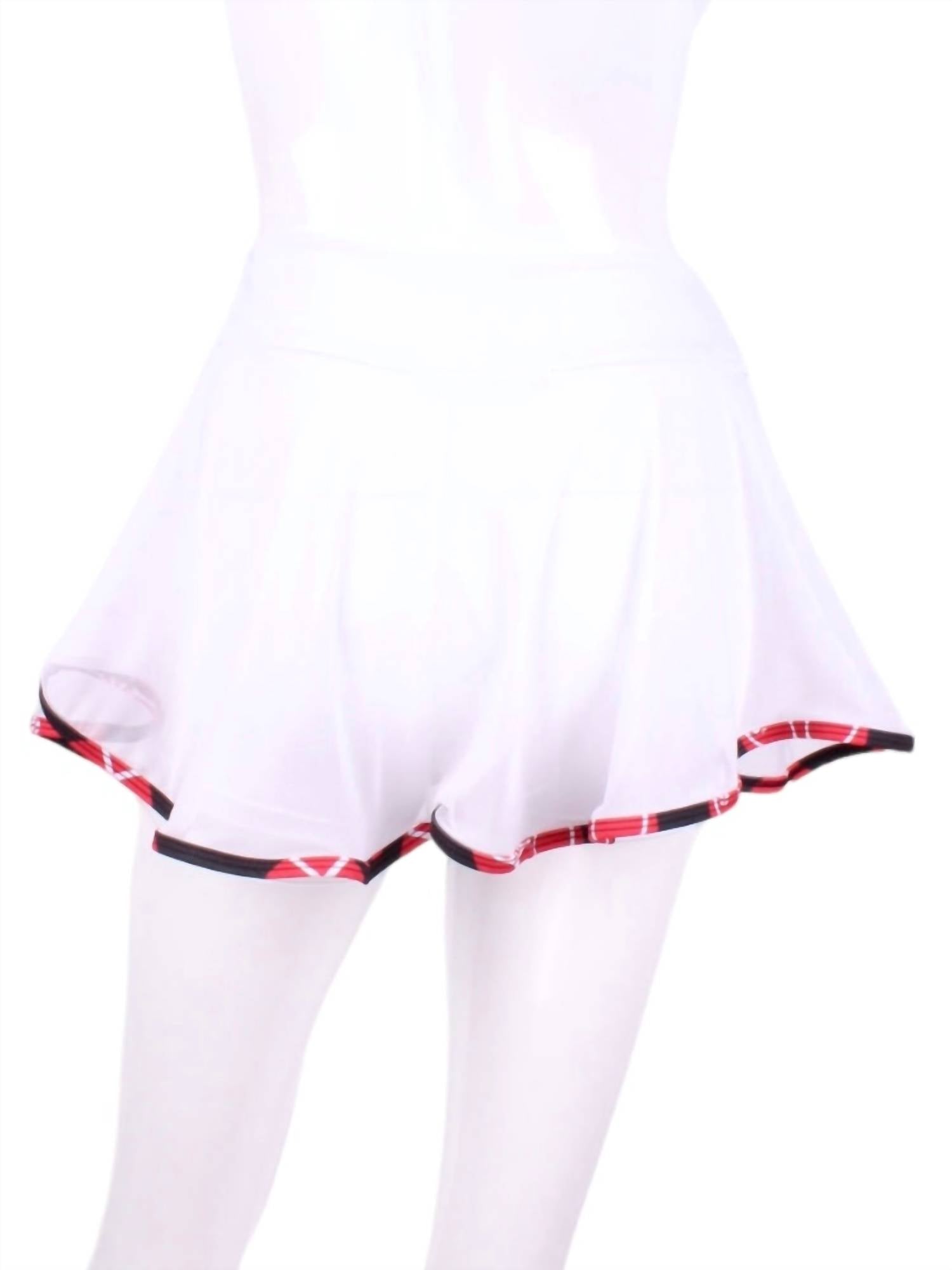 Show just the right amount of leg in this fit flattering mini. Discover the Women's Love "O" Skirt by Love Love Tennis, a fashionable athleisure piece in patterned white mesh perfect for game day. This mini skirt features an innovative design with shorties underneath, ensuring both style and comfort. Handmade in downto