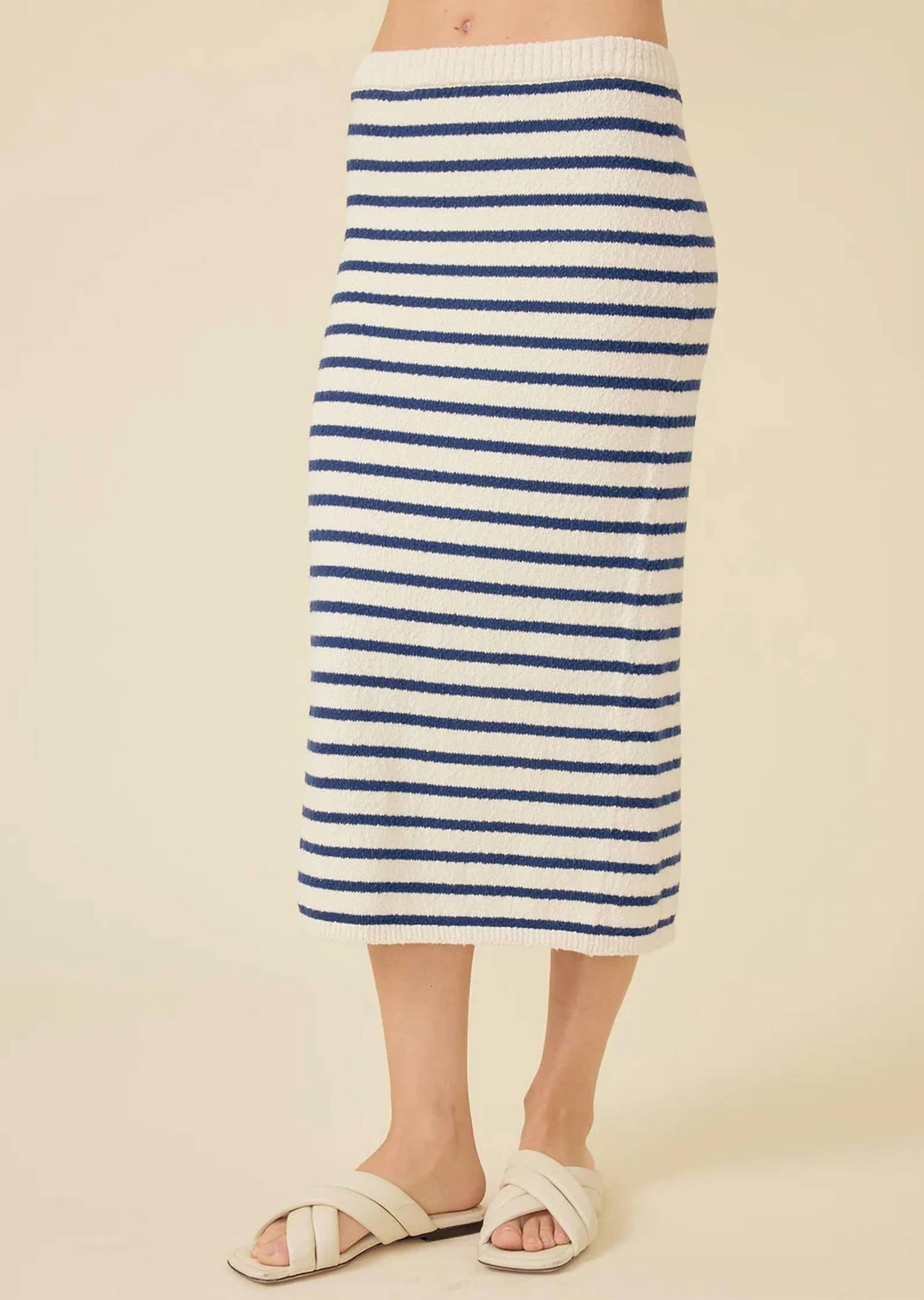 Knit in our novelty chunky cotton slub yarn, this midi skirt. Featuring a fun stripe. Model is 5'9" wearing size small. Hand wash cold. 100% Cotton.