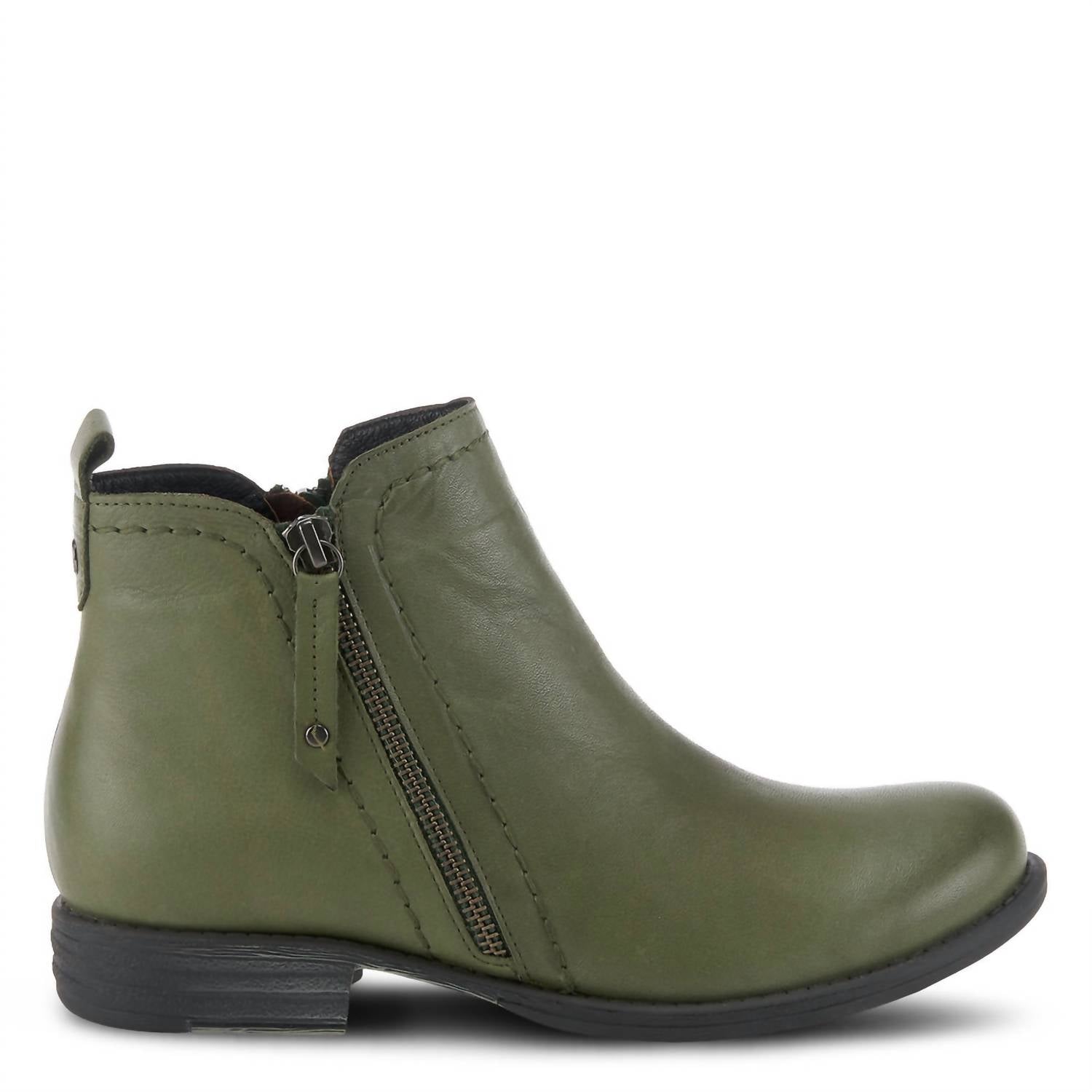 Classic leather bootie featuring a decorative outside zipper with a studded leather zipper pull, functional inside zipper, back pull up tab and thick accent stitches all on a flat, chunky heel.