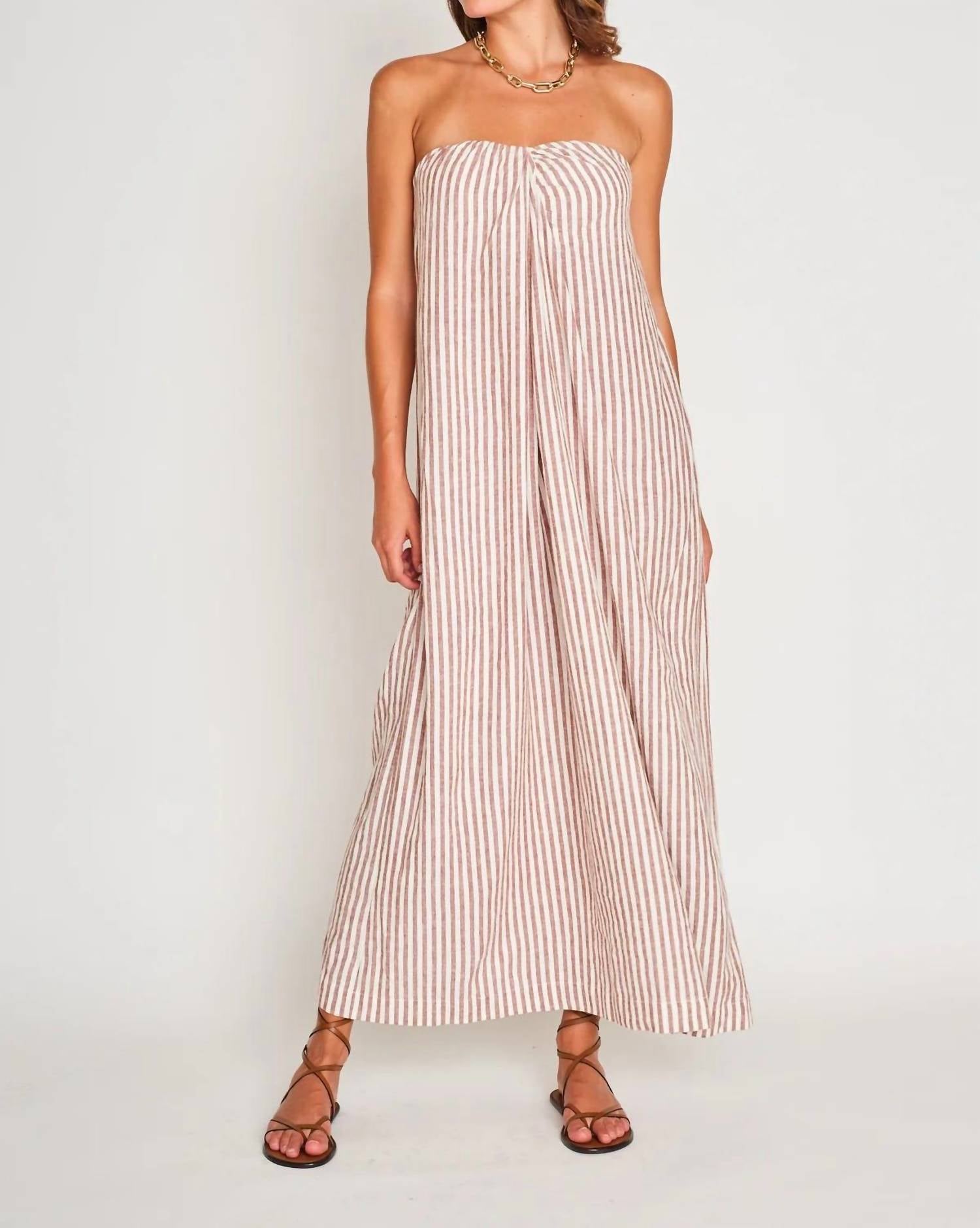 Introducing the Rosalyn Strapless Maxi Dress by dRA Los Angeles, a striking piece with a chic bodice knot and sophisticated pleat details. This A-line dress features a Sedona Stripe pattern in red and cream, offering a flattering silhouette with a relaxed fit for all-day comfort. Crafted in a strapless design with convenient side pockets, it's perfect for sunny days or evening outings. Closure: Pull-on.
