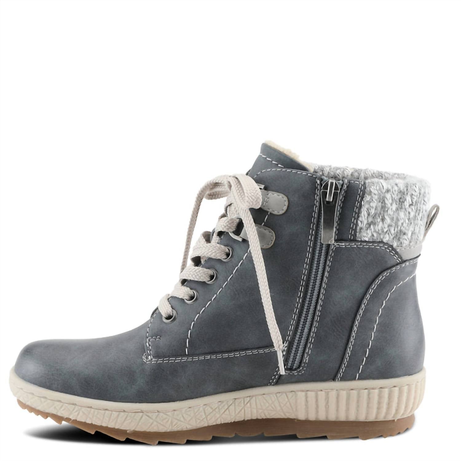 Introducing the Women's Karlene Side Zip Lace Booties by Spring Step Shoes, a stylish grey ankle bootie that's perfect for any occasion. Crafted with a synthetic upper and featuring a cozy sherpa-like textile lining, these booties are vegan-friendly and water-resistant. The lace-up and side zipper closure offer convenience, complemented by a round toe design and a shock-absorbing TPR outsole for all-day comfort. With a heel height of 1.5 inches and a platform height of 1 1/8 inches, these booties are both practical and fashionable.