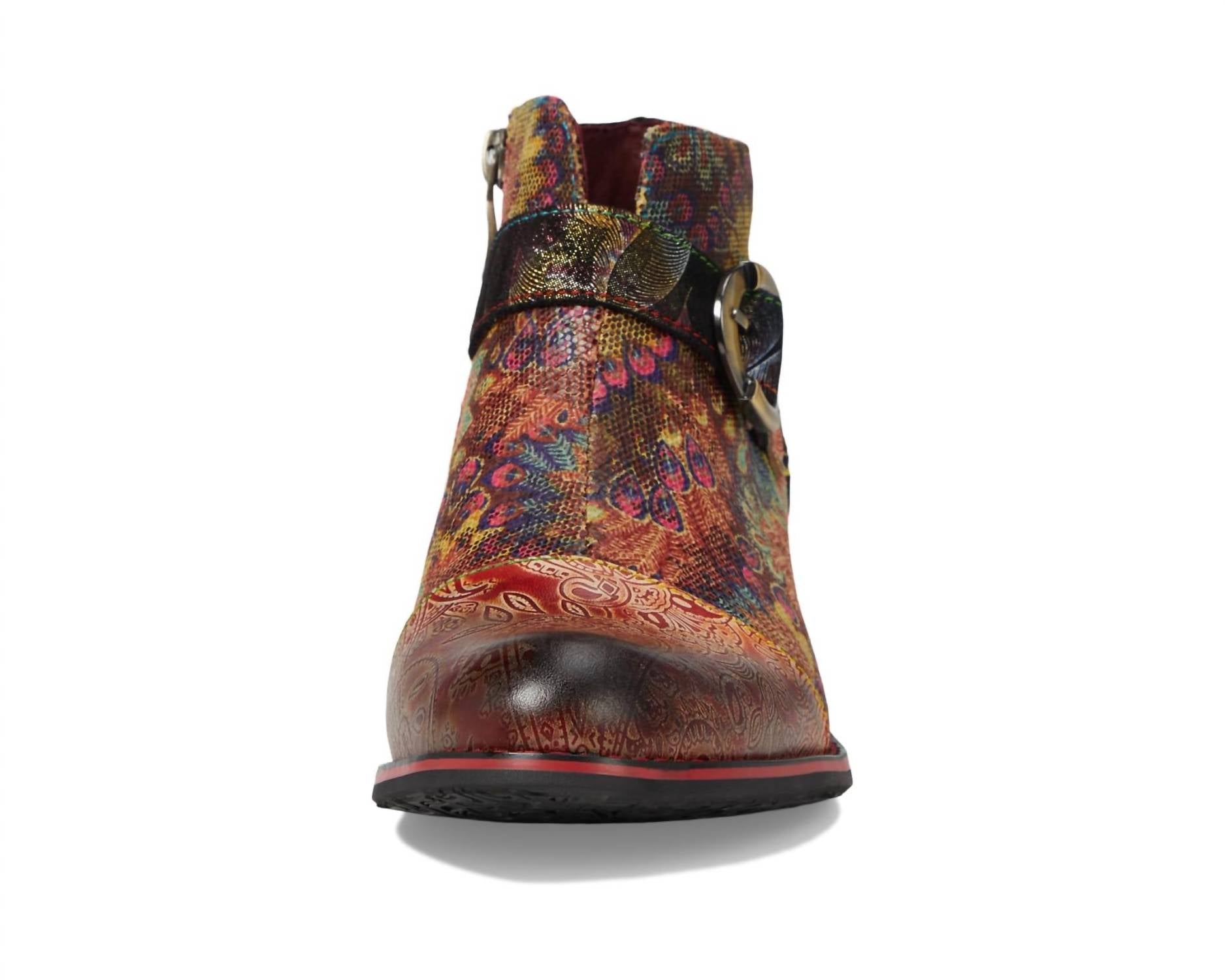 Step out in style with the Women's Georgiana Scope Bootie from SPRING STEP SHOES, a captivating piece for the fall season. These ankle-high boots feature a unique hand-painted leather upper, with a striking buckle strap accent and an almond toe design. They are designed for comfort with a textile and velvet lining, and a synthetic padded insole, all finished with a flexible rubber outsole for durability. Closure: Zippered side closure. Heel Height: 1.5 inches. Perfect for a holiday party, they embody the quiet luxury trend in a Camel Multi palette.