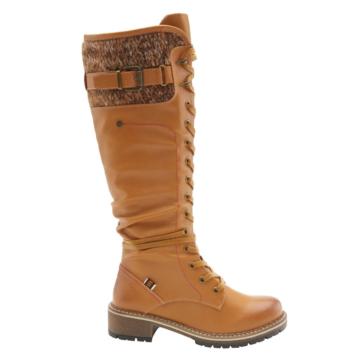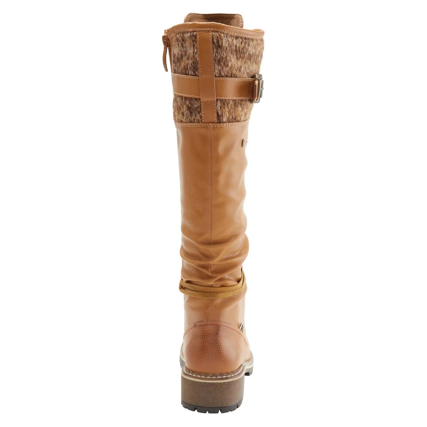 A cozy knit cuff with buckle strap detail. Mixed-media appeal to this lace up tall boot designed. Slight slouch. Contrast decorate stitching on shaft and heel. Flexible lug sole and faux stacked heel. Faux fur lining and insole.