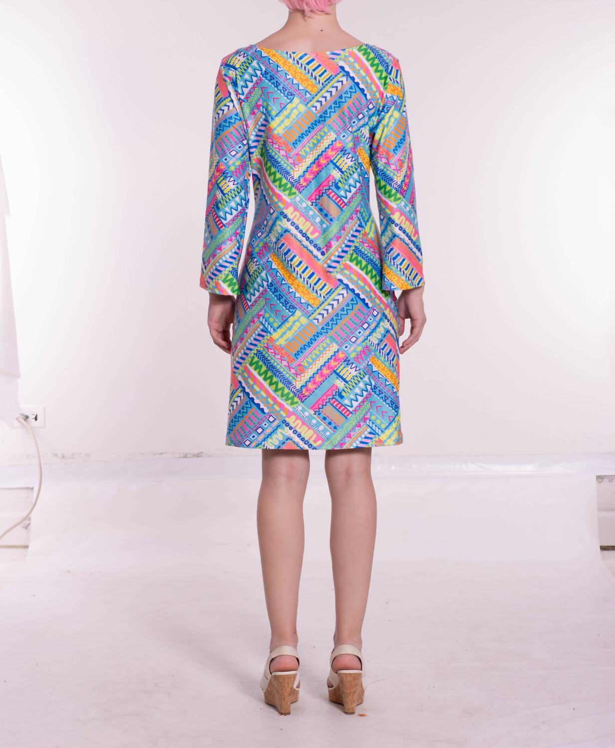 The Candice Mini Dress by Michelle Parisou offers a delightful touch of whimsy with its vibrant zigzag crayon print. Featuring a classic boat neckline and playful three-quarter flared sleeves, this A-line silhouette flatters all figures with its relaxed charm. Closure: Pull-on style. Ideal for vacation wear and perfect for spring or Easter occasions. Enjoy turning heads with this maximalist, patterned gem in your wardrobe.