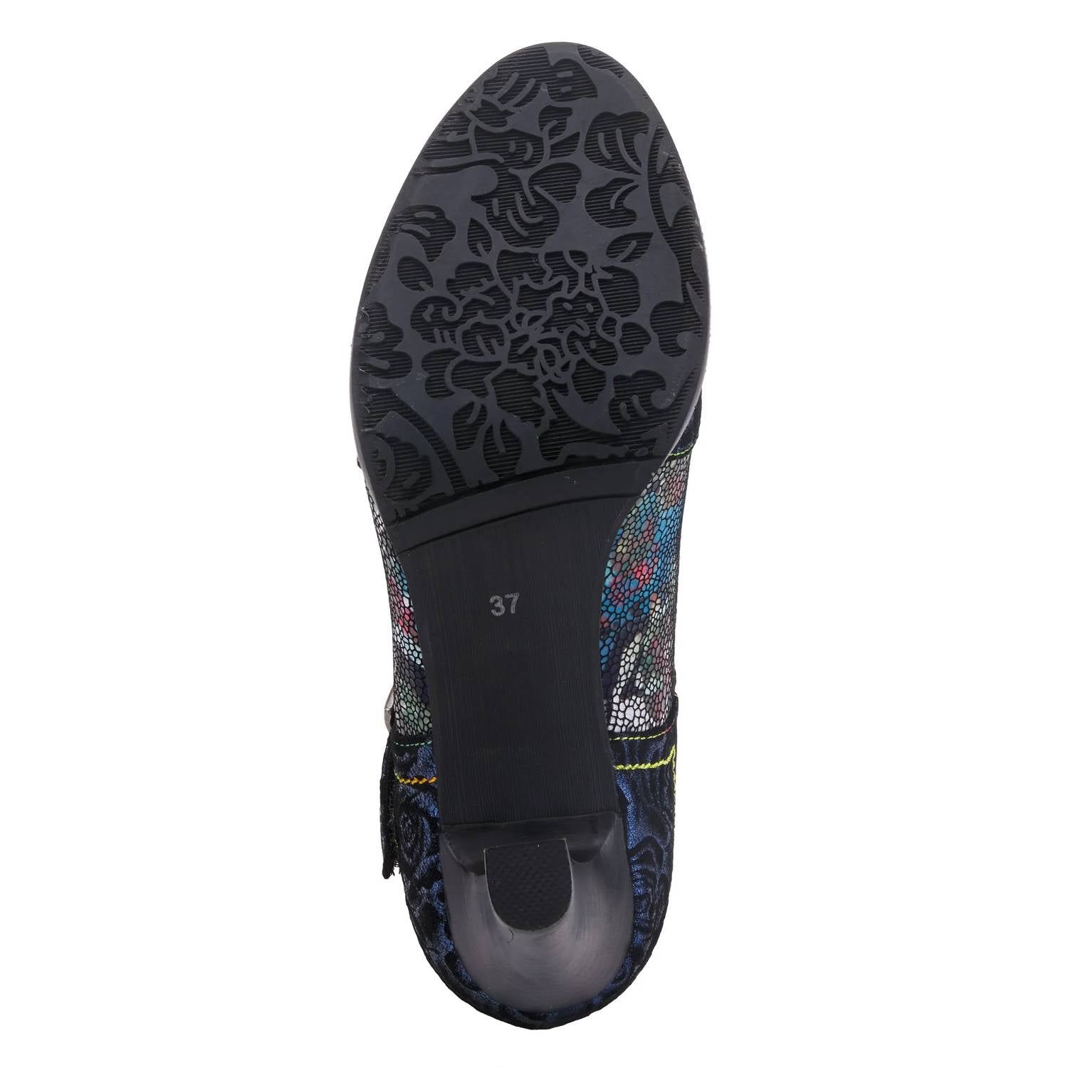 Step out in style with the Mazie Casual Strap Heels by Spring Step Shoes, crafted in a striking Navy Multi finish. These heels feature a heel height of approximately 3 ¼ inches with a ¼-inch platform for an added lift. The design combines two-tone textured floral metallic printed leather with colorful mosaic-patterned shiny leather, complemented by a T-Bar strap and decorative brushed metal buckle. Enhanced with imitation leather lining, a comfortable padded footbed, and a sophisticated architectural heel, these shoes promise comfort without compromising on elegance.