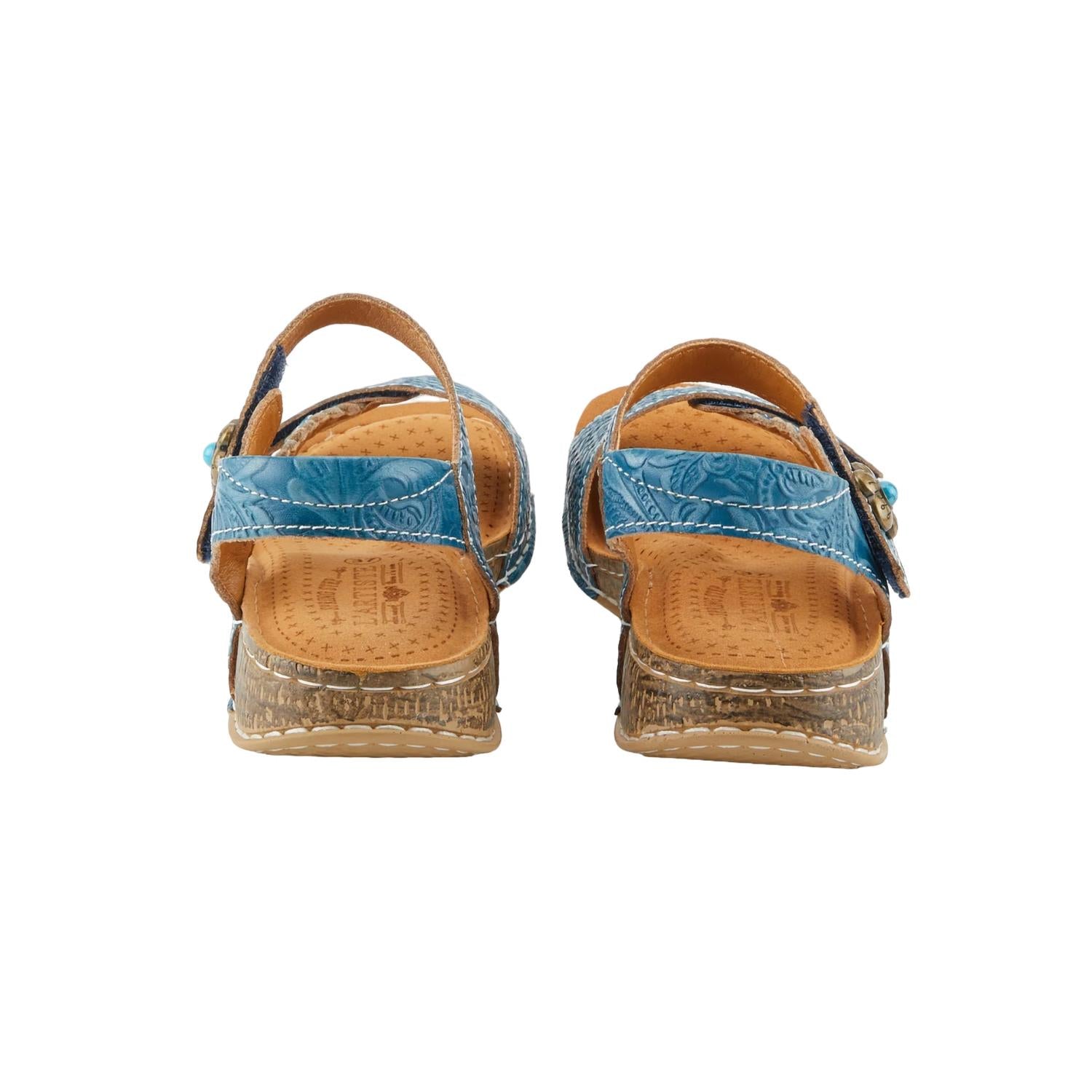 Flowy dresses, cropped pants, and even jumpsuits... this sandal works with them all! Embossed floral pattern, lattice work at the top and braided asymmetrical side strap with an antiqued flower. Hook and Loop Velcro closure and padded back strap. 1.25" Heel height. 1/2" Platform height.