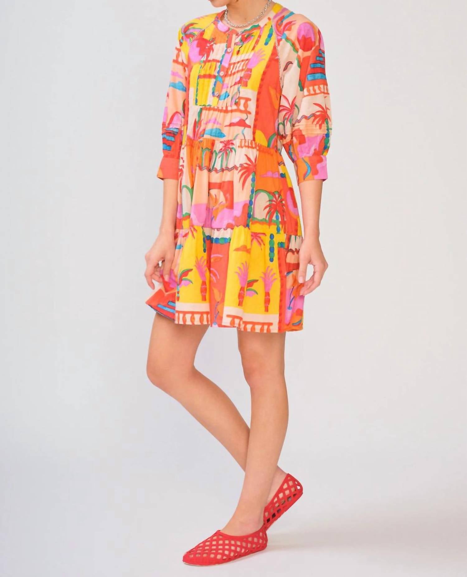 Introducing the Yara Half Sleeves Mini Dress by dRA Los Angeles, a boho chic addition for your spring wardrobe. This A-line dress boasts elbow-length raglan sleeves adorned with ladder lace details and features a pin-tuck, button-up bodice. Crafted from cotton in a vibrant Tropical Palms print, its tiered skirt falls just above the knees. Closure: Button closure. Care: Machine wash, line dry. Perfect for an anniversary celebration or Thanksgiving gathering.