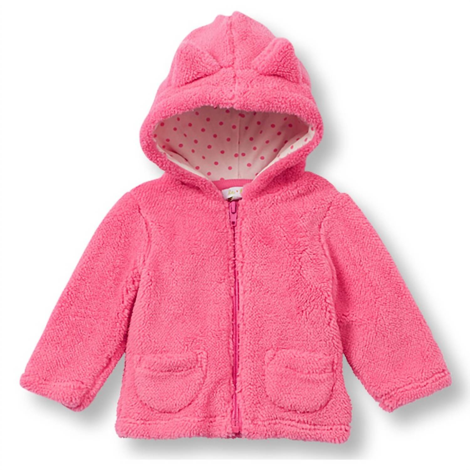 Like warm kitten snuggles in plush jacket form! This super-cute and extra-plush jacket with adorable kitten ears will make playtime fun for your baby girl all fall and winter long. Dual patch pockets, a hot pink zipper, and a pink on white polka dot lining complete the look. 100% polyester outer and 95% Cotton/5% Spand