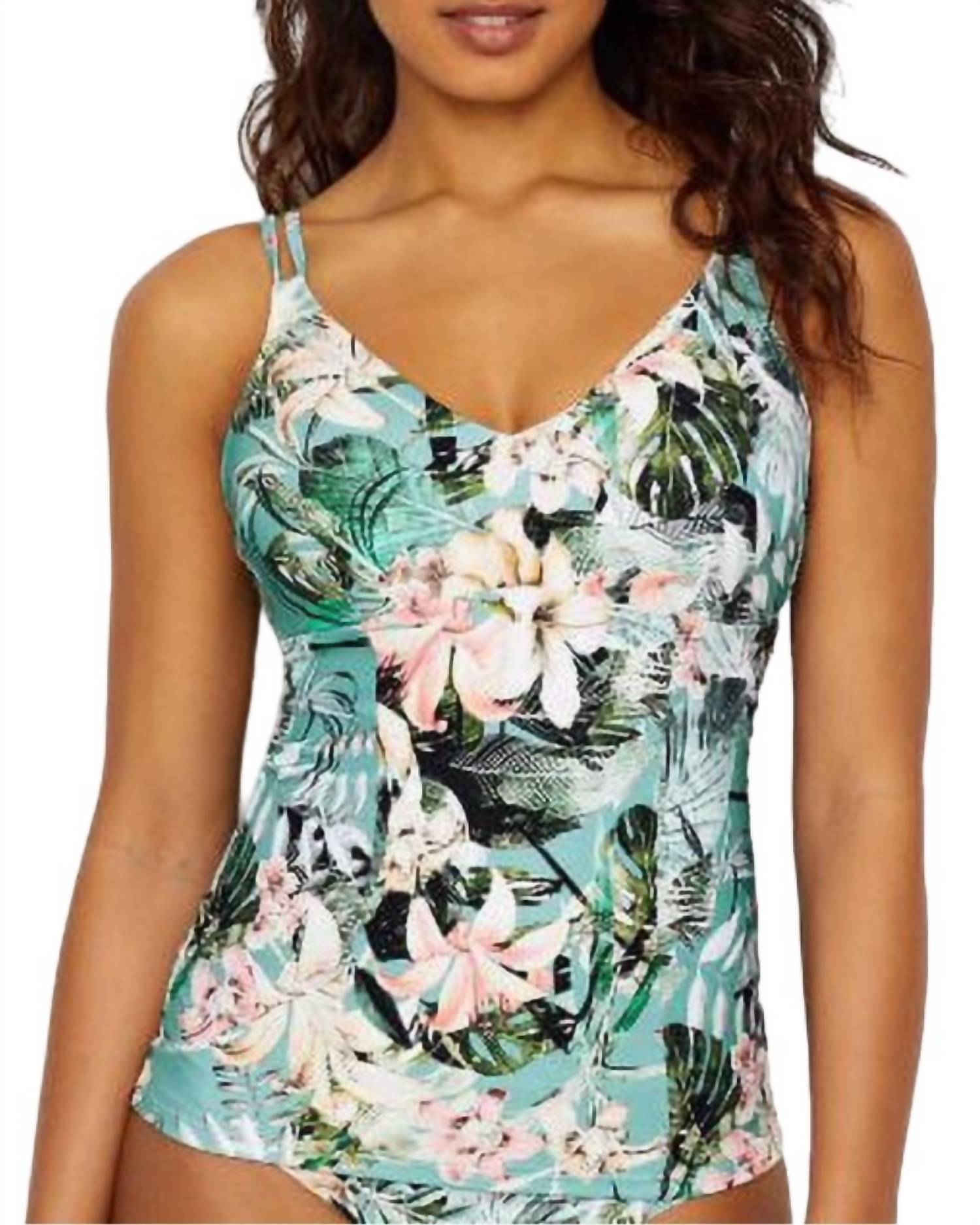 Chic floral print underwire tankini top. Reduces bust appearance by 1 cup size. Double-layer cups with inner sling and side boning. Adjustable back stretch straps. Adjustable slide hook closure with 3 adjustment options.