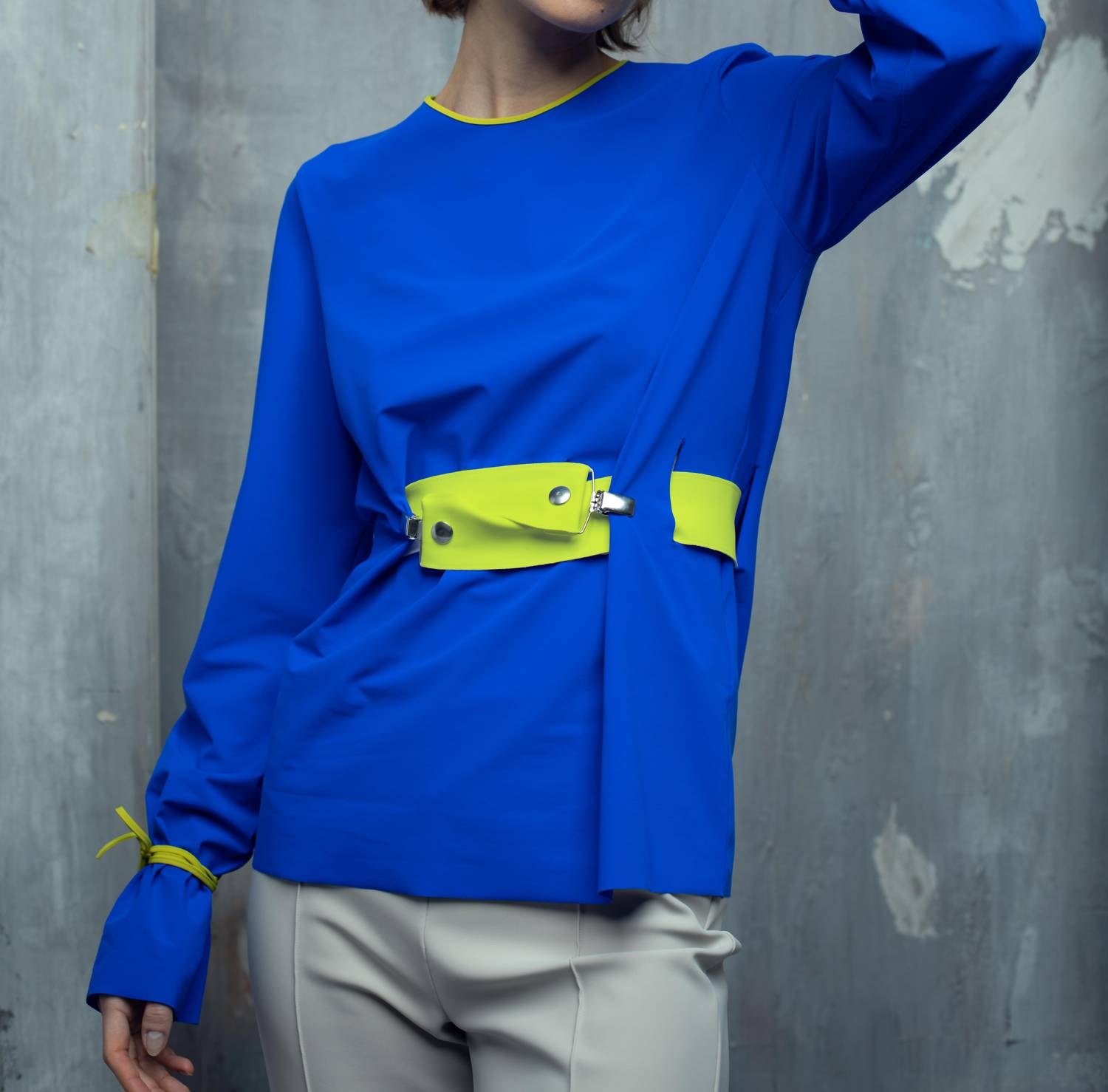 Great fit, cute design, soft fabric. You'll love everything about this long sleeve tee. Chic Top in Bright Blue with Lime Trim Belted Lime Tie Detail at Sleeves Travel Friendly Fabric Sustainable Fabric 72% Polyamide, 28% Elastane Made in Italy