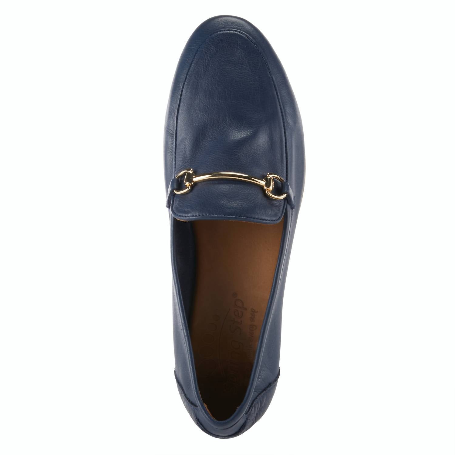 The Women's Anianka Loafer by SPRING STEP SHOES is a luxurious addition to any wardrobe, featuring a sophisticated navy hue. Crafted from buttery leather on the upper, lining, and insole, this loafer ensures a premium feel, complemented by a flexible TPU outsole and a gold-tone polished bit for elegance. With a true-to-size fit, elastic sole, and a comfortable padded insole, this almond-toe loafer is perfect for both casual and dressy occasions. Made in Turkey, it features a flat heel of 0.75 inches, ideal for the workwear trend.