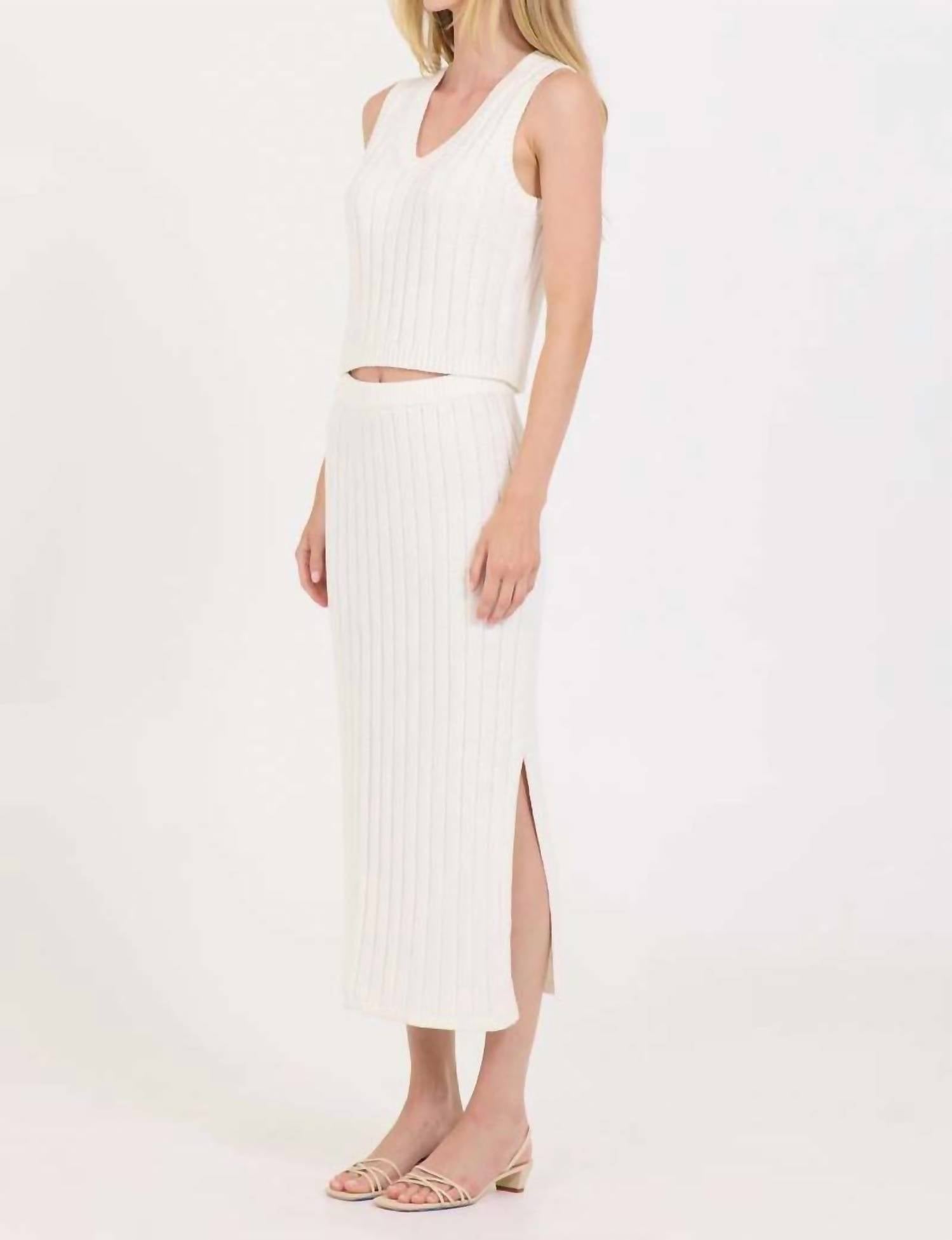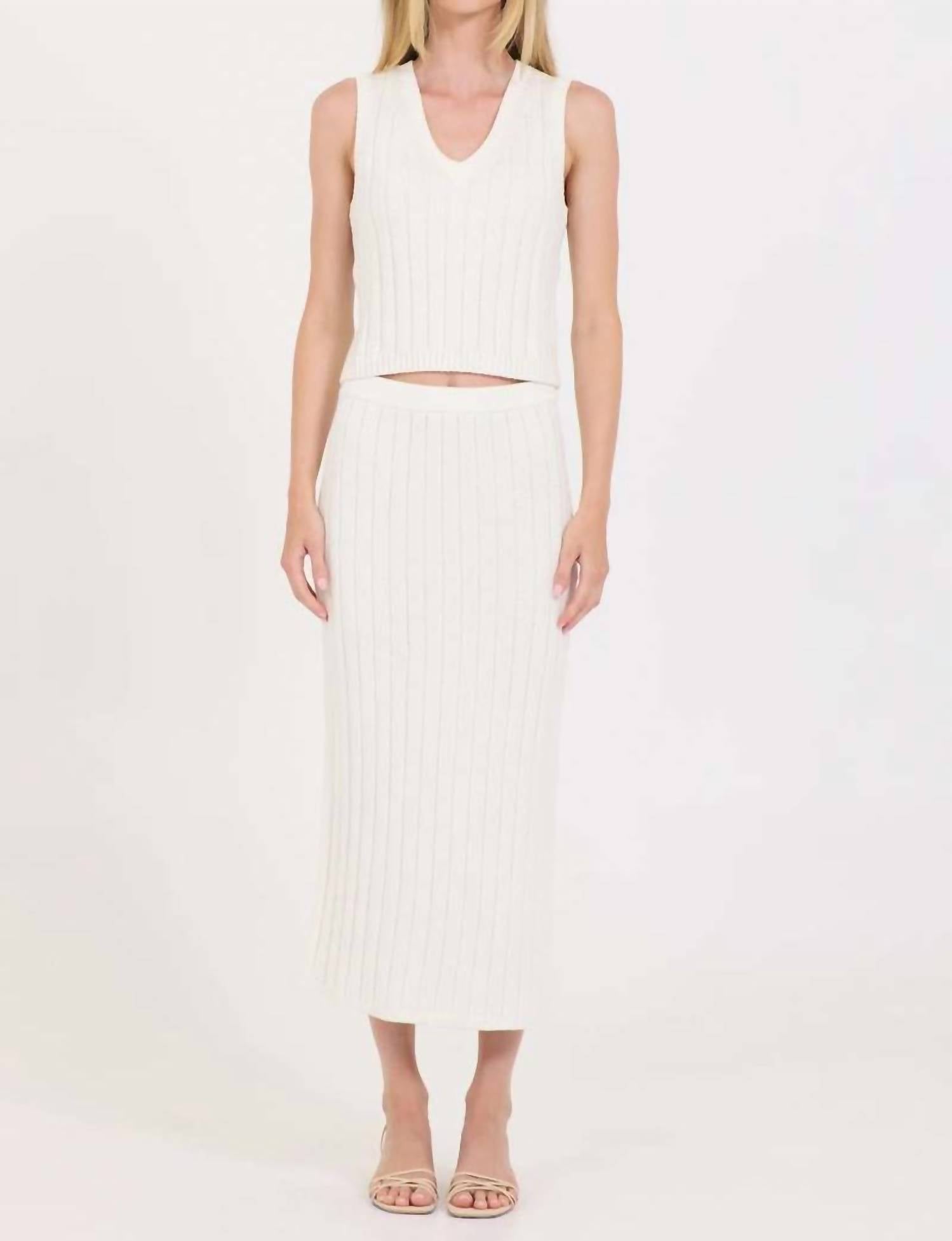 Tuck in your favorite tee for a more casual yet feminine look. Elevate your spring wardrobe with the Lazlo Knit Skirt by One Grey Day, a stunning ivory maxi skirt perfect for a dinner party or Valentine’s Day celebration. Crafted from a luxurious cotton, nylon, and silk blend, this skirt features a chic, wide rib patte