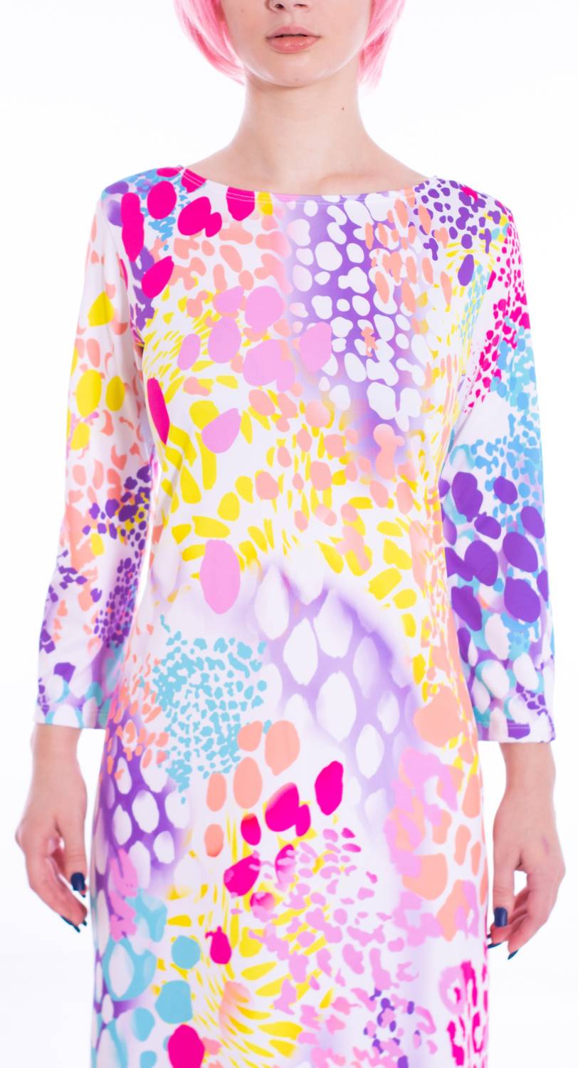 The Candice Mini Dress by Michelle Parisou is a vibrant addition to your spring wardrobe, designed to make a bold statement with its kaleidoscope leopard print. This A-line dress features three-quarter flared sleeves and a chic boat neckline, offering a playful yet feminine silhouette. The pull-on closure ensures easy wear, and its short length makes it perfect for vacation adventures or turning heads at casual gatherings. Add this colorful piece to your collection for a splash of wild style.