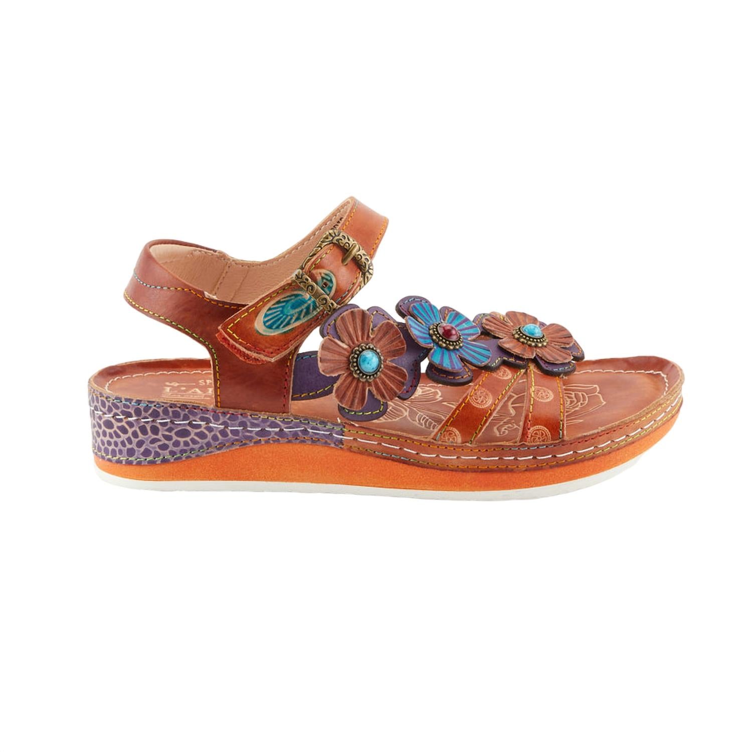 Classicly cute and all-day-wearable. We love this sandal. Asymmetrical embossed flower pattern across the top. Features fun colors, a brass buckle and flower detail. Padded leather back strap. 1 1/2" Heel height. 1" platform. High quality leather upper, round toe silhouette, leather-wrapped outsole.. Adjustable hook an