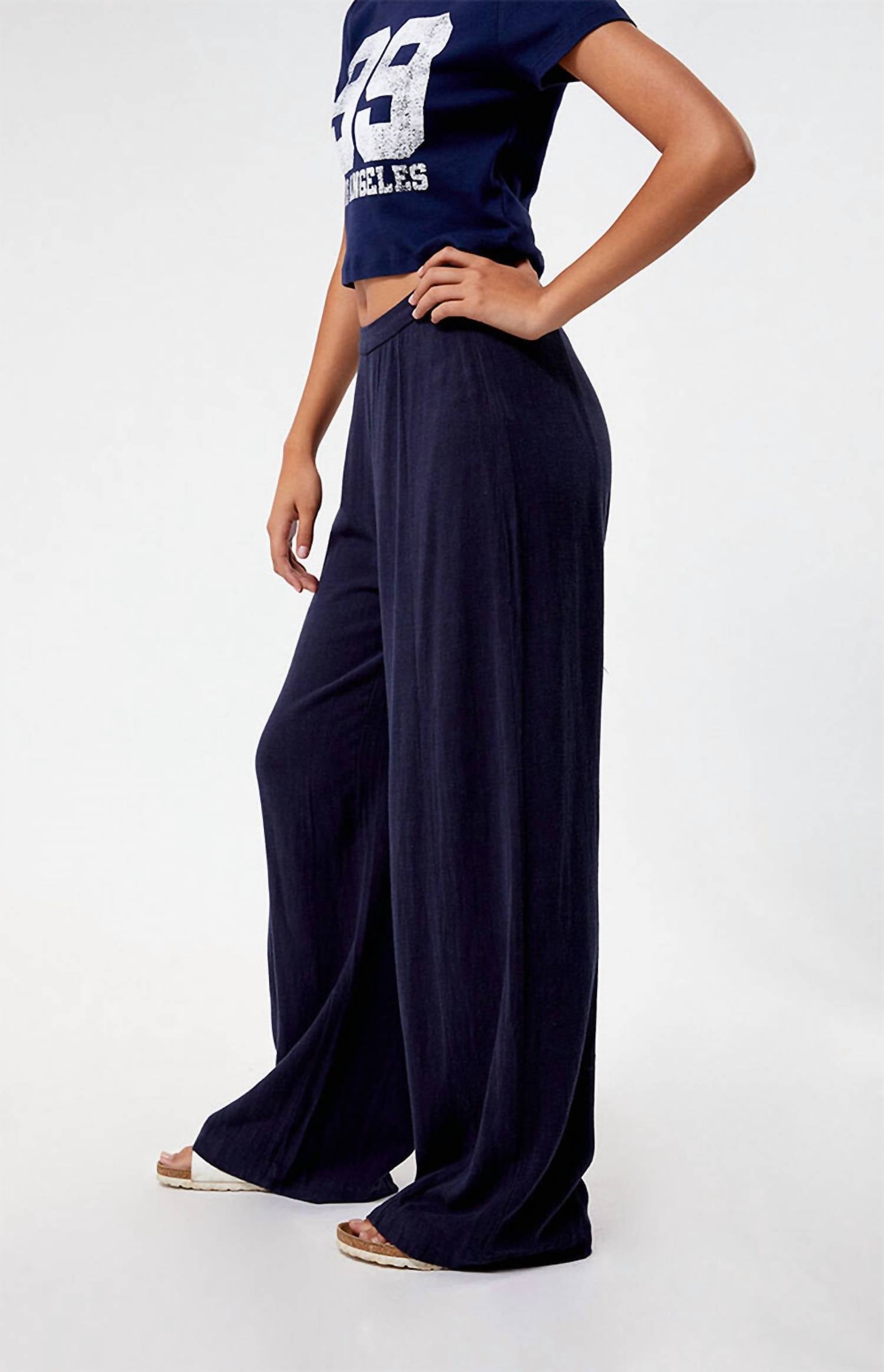 Clean lines and ultimate comfortable navy trousers. Showcase an extra-wide leg with panel lines, complemented by a high-rise, fixed clean waistband. Composed of 65% linen and 35% cotton. Full-length pants feature a 30" inseam and a discreet side seam invisible zipper for a seamless look. With a solid pattern and relaxed fit. Machine washable for ease.