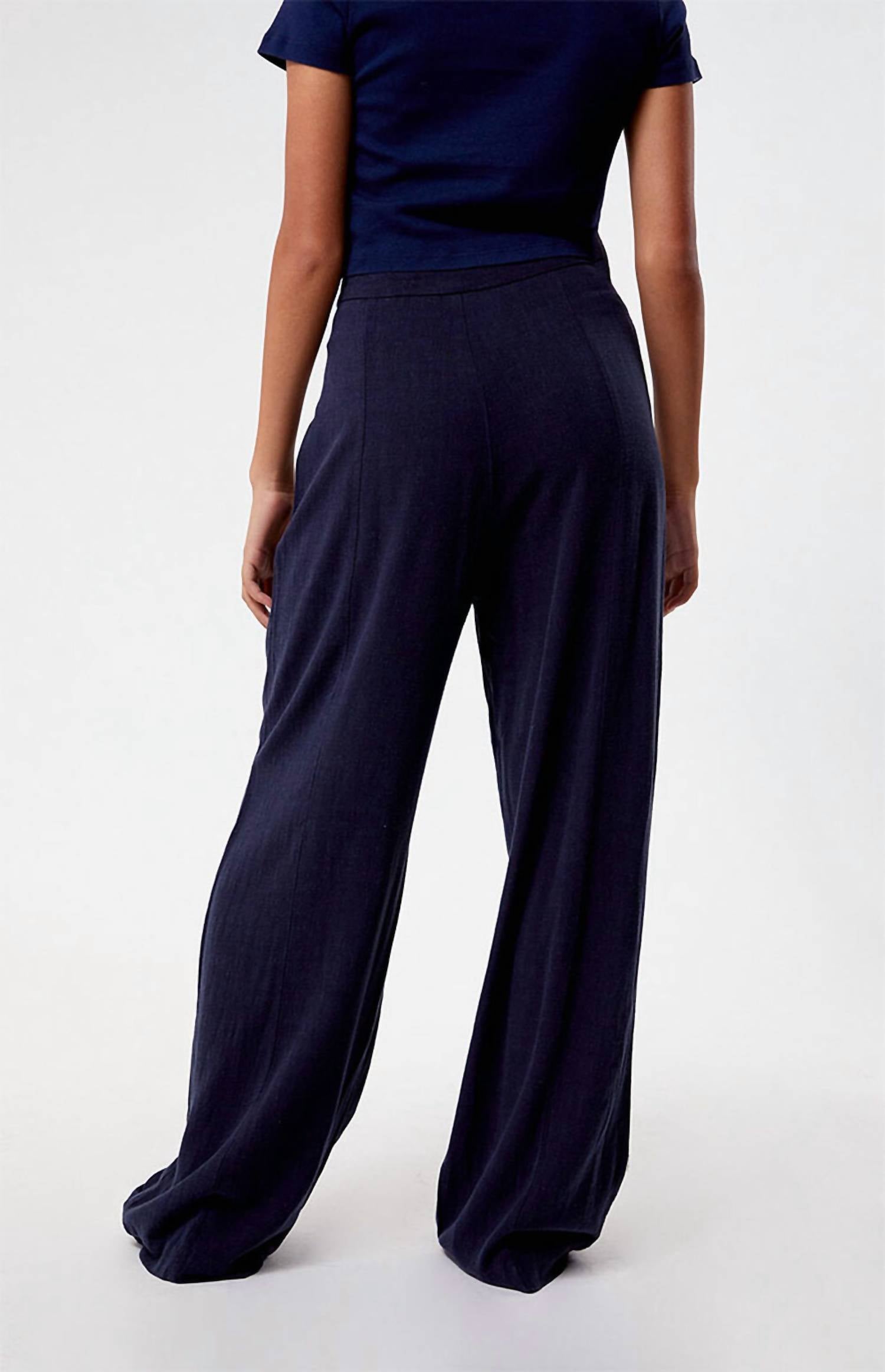 Clean lines and ultimate comfortable navy trousers. Showcase an extra-wide leg with panel lines, complemented by a high-rise, fixed clean waistband. Composed of 65% linen and 35% cotton. Full-length pants feature a 30" inseam and a discreet side seam invisible zipper for a seamless look. With a solid pattern and relaxe