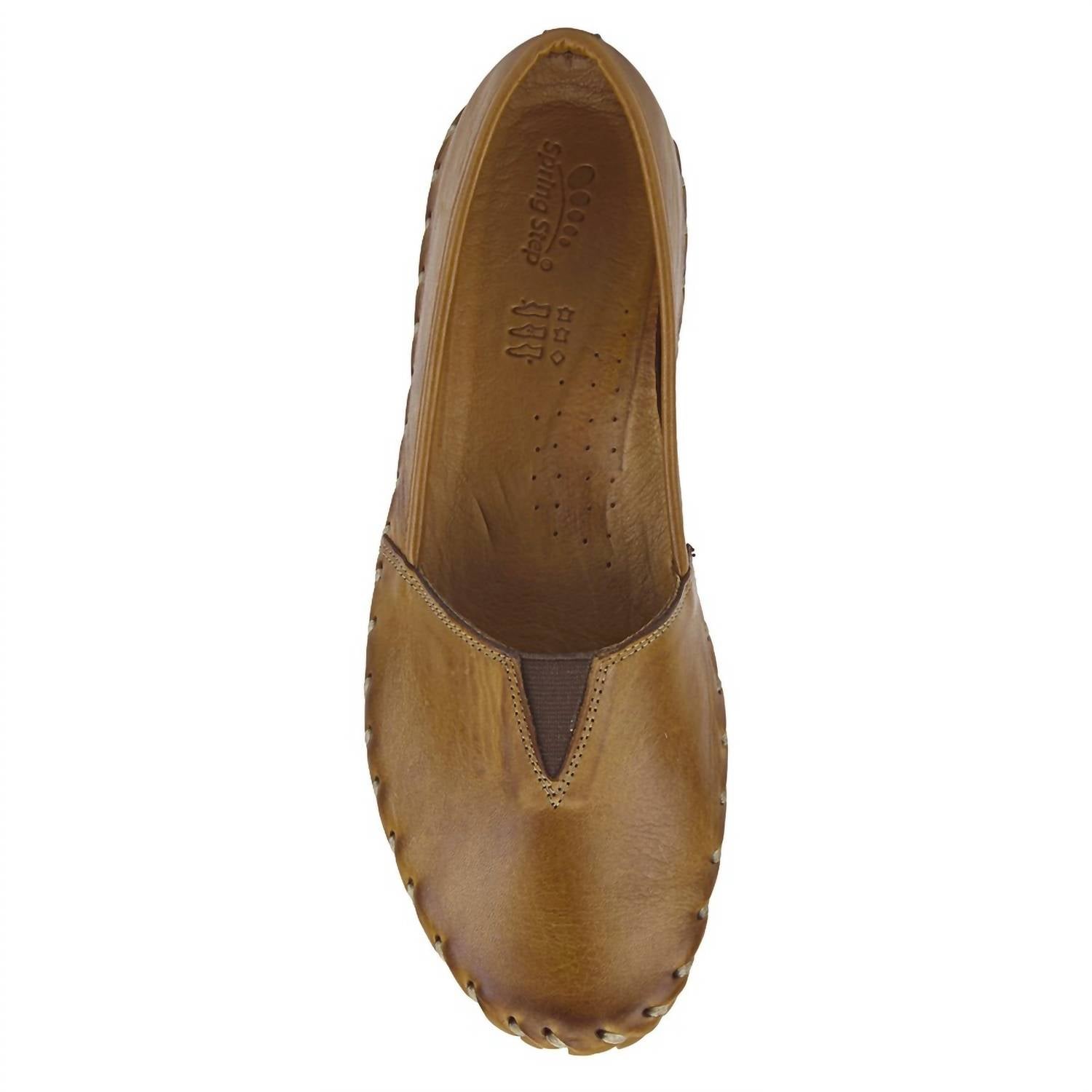 Leather upper in a slip on loafer style with an almond toe. Easy slip on entry. Tonal stitch detailing. Leather lining with padded, elastic removable insole. Flexible rubber outsole.