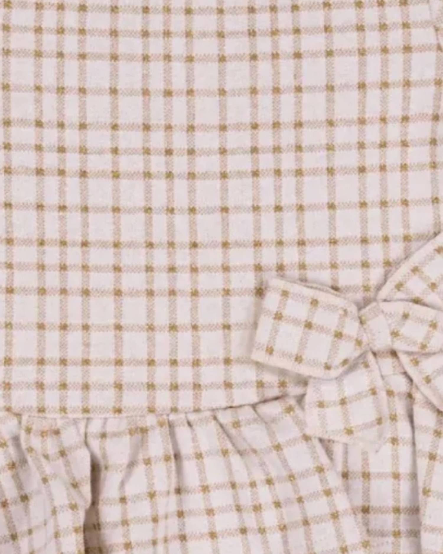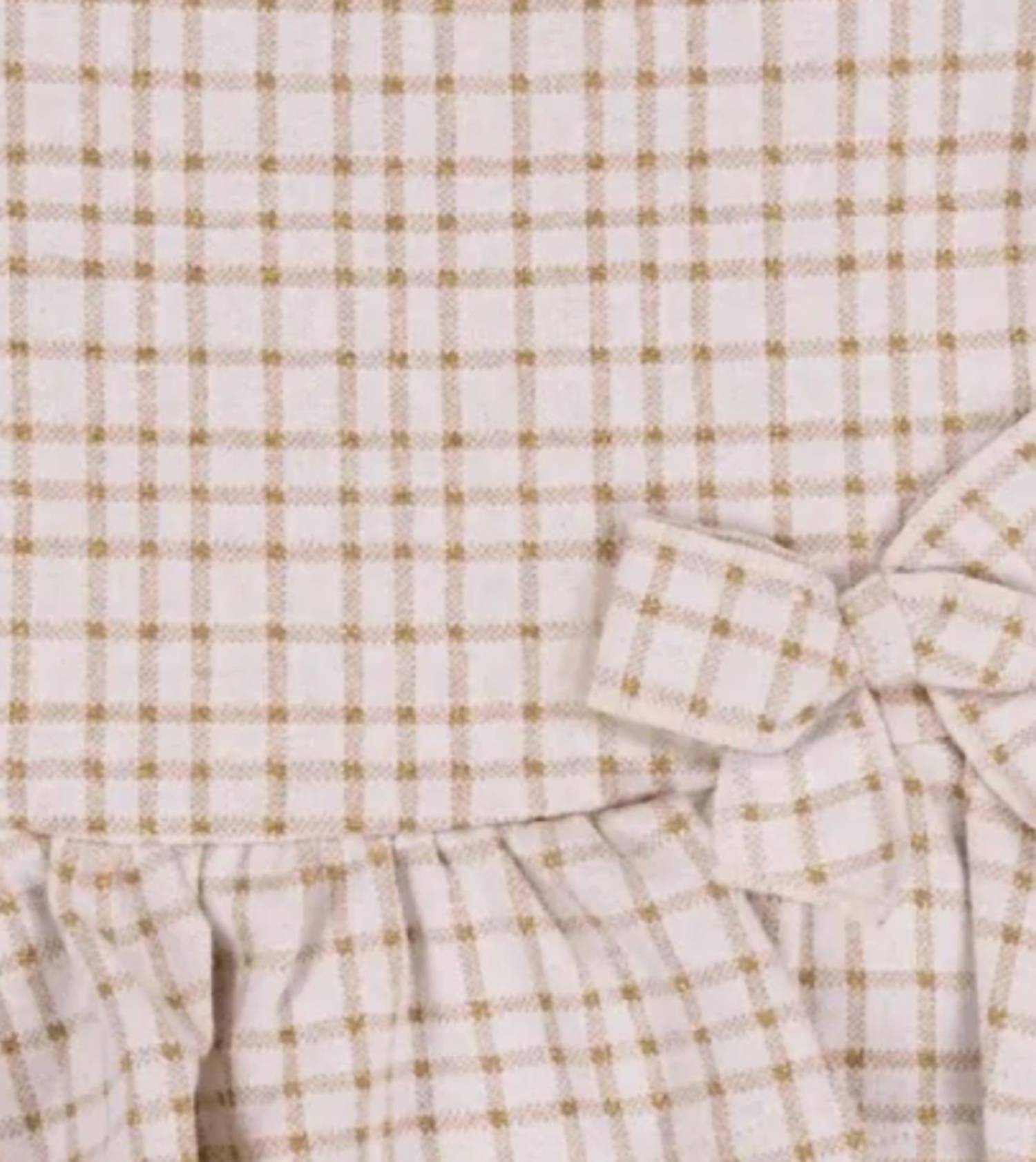 Introducing the Girls' Long Sleeve Metallic Plaid Knit Dress by EMC, perfect for adding elegance to your little lady's wardrobe. This charming dress features a gold metallic plaid design with lovely ruffle details and a bow accent. Crafted from a cotton blend, it includes a composition of 65% Cotton, 21% Metal, 13% Pol