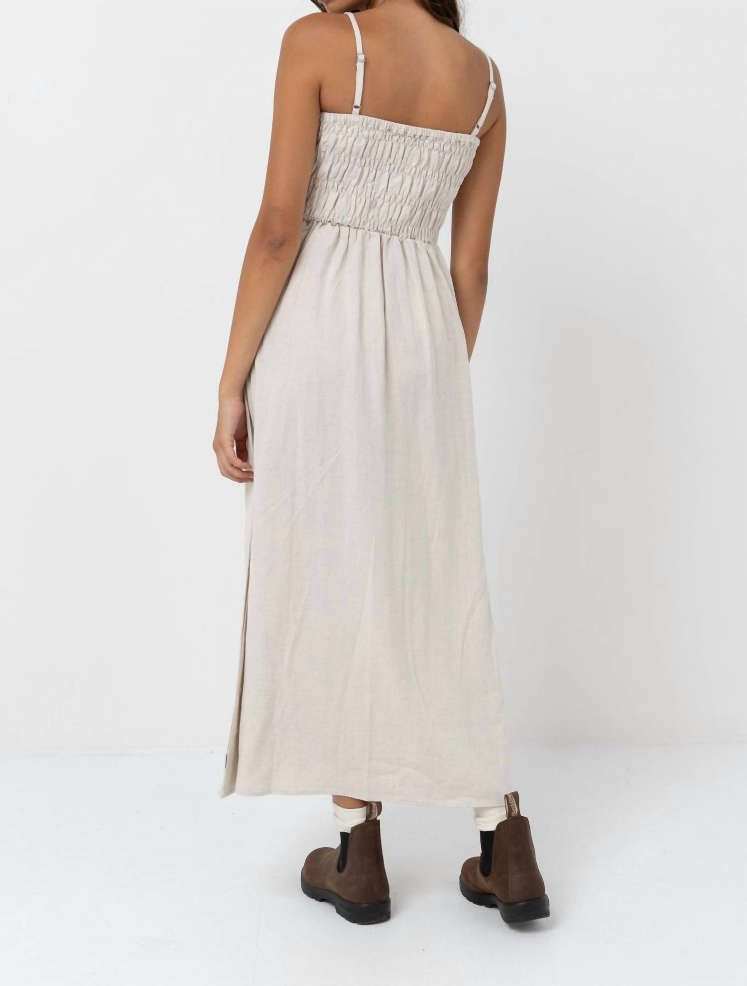 The Women's Classic Shirred Midi Dress by Rhythm is your go-to for breezy summer days in a relaxed oat hue. Crafted with 60% Rayon and 40% Linen, it offers a linen look with a soft feel and subtle drape. Featuring a smocked front and back bodice, straight neckline, and spaghetti straps, this fit and flare silhouette adds an effortless touch to your vacation wardrobe. Designed for easy wear with a pull-on closure, this dress combines comfort with boho chic style. Eliza, our model, wears a size 8 (181cm height, 79cm bust, 64cm waist, 94cm hips).