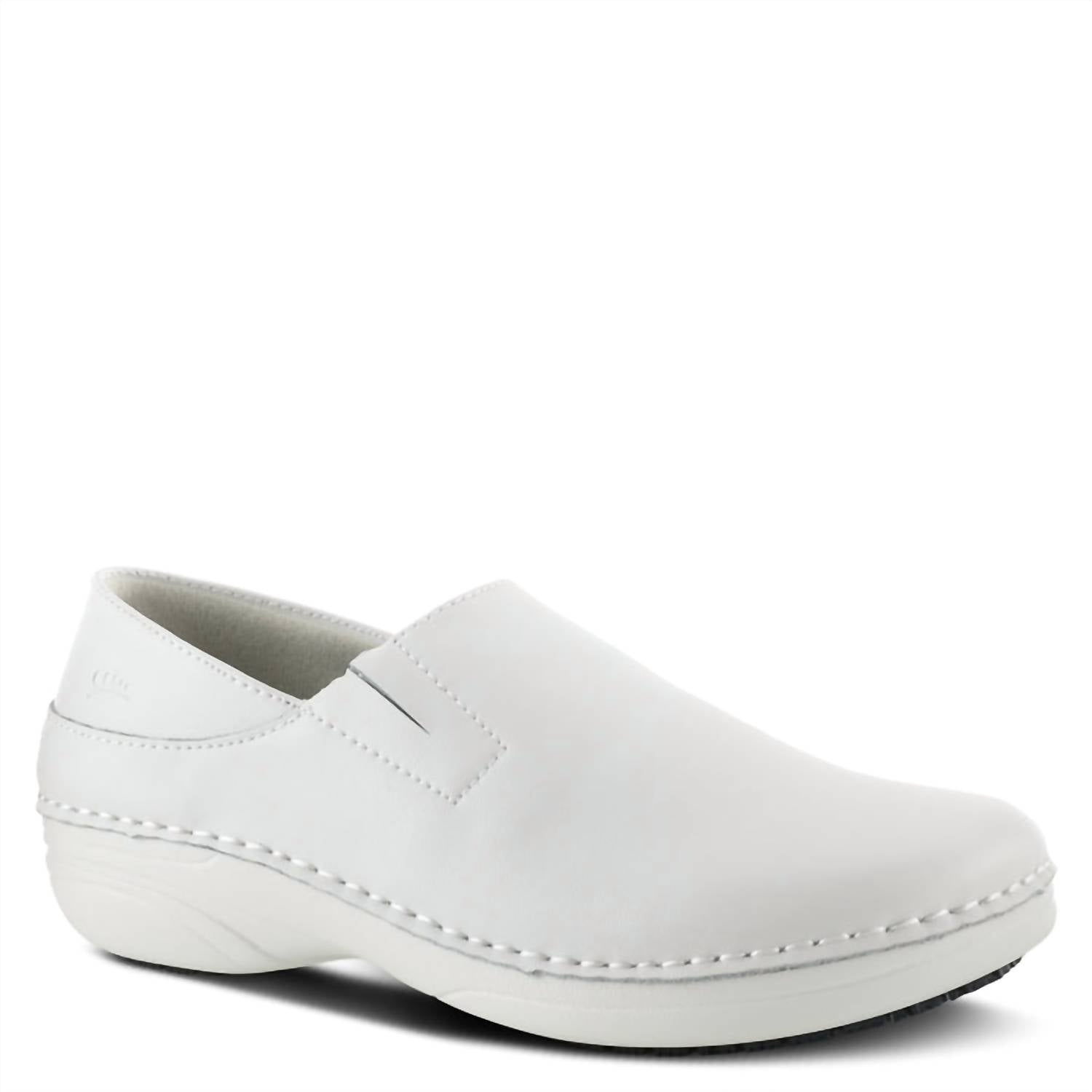 White work clogs, nurse shoes, restaurant Shoes. Durable and comfortable describe the Spring Step Manila duty shoe. This slip-on features an oil resistant sole and comfort cushioning making it great for those long days at work.medium widthoil resistant skid resistant professional work shoesFor work, hospital, restaurant, office, walking, comfort, slip-on, removable insoles.AdultWhite
