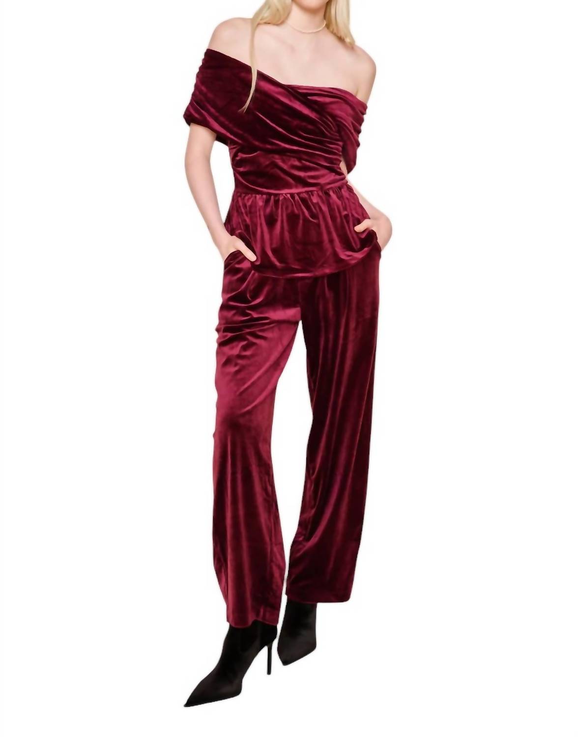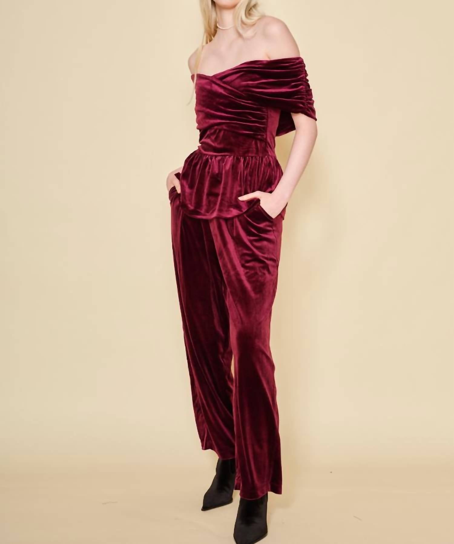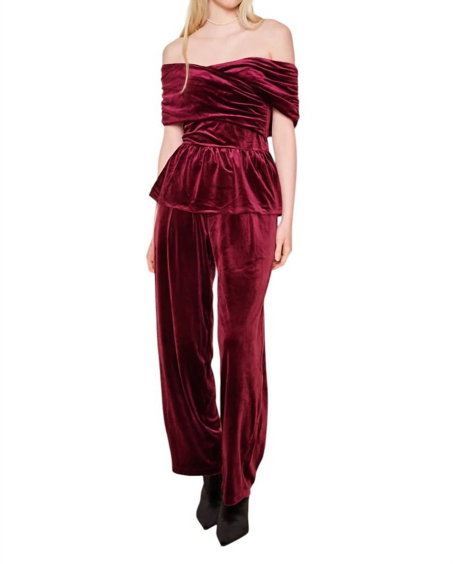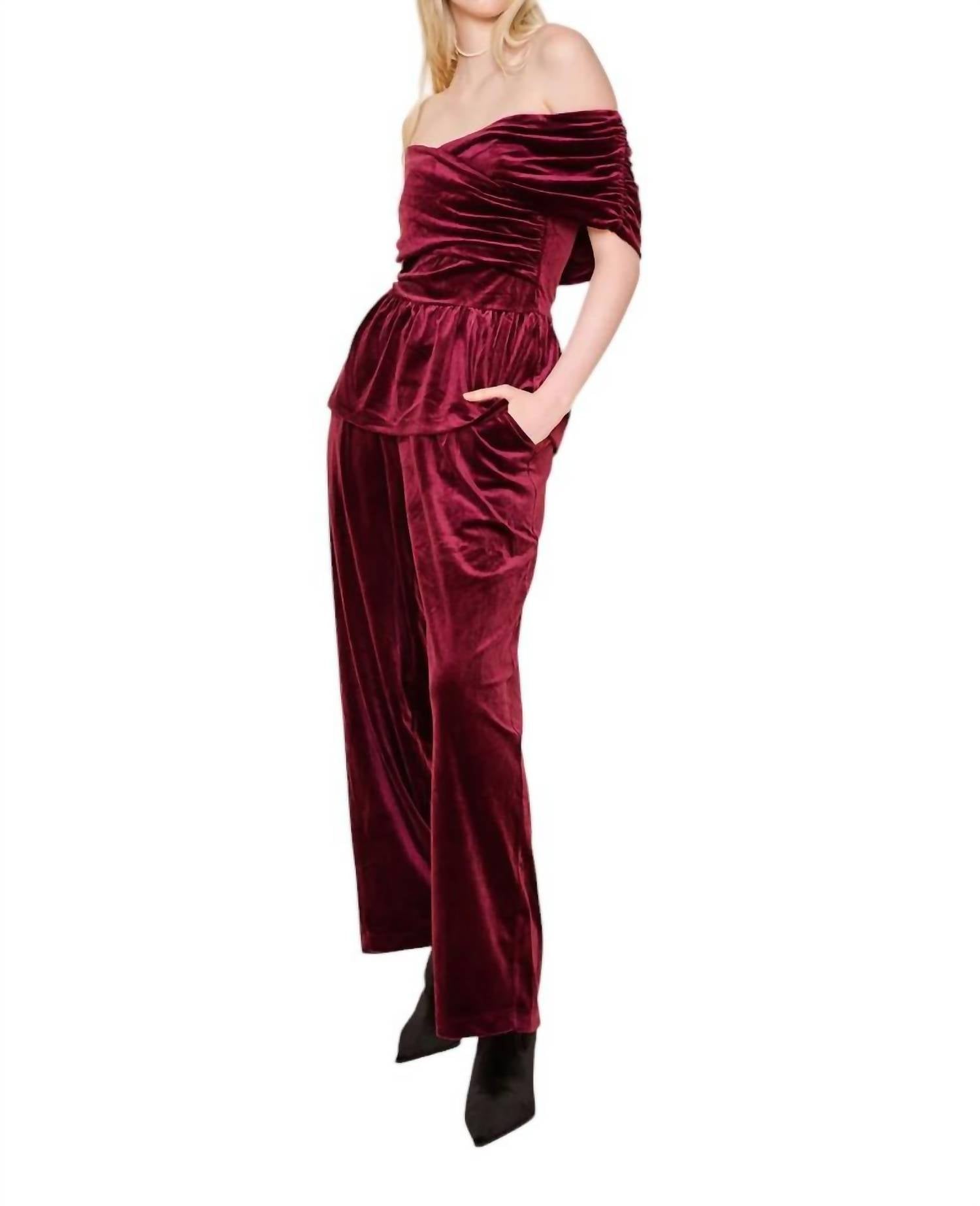 Introducing the dRA Los Angeles Coraline Top, a sophisticated choice for your fall wardrobe in a deep plum hue. This off-the-shoulder blouse features short sleeves and is crafted from a luxurious blend of 94% polyester and 6% spandex. The smocked bodice with ruching and a delicate peplum adds romantic flair and elegance, perfect for a dinner party or special occasions. Closure is a discreet zip, making it as functional as it is stylish.
