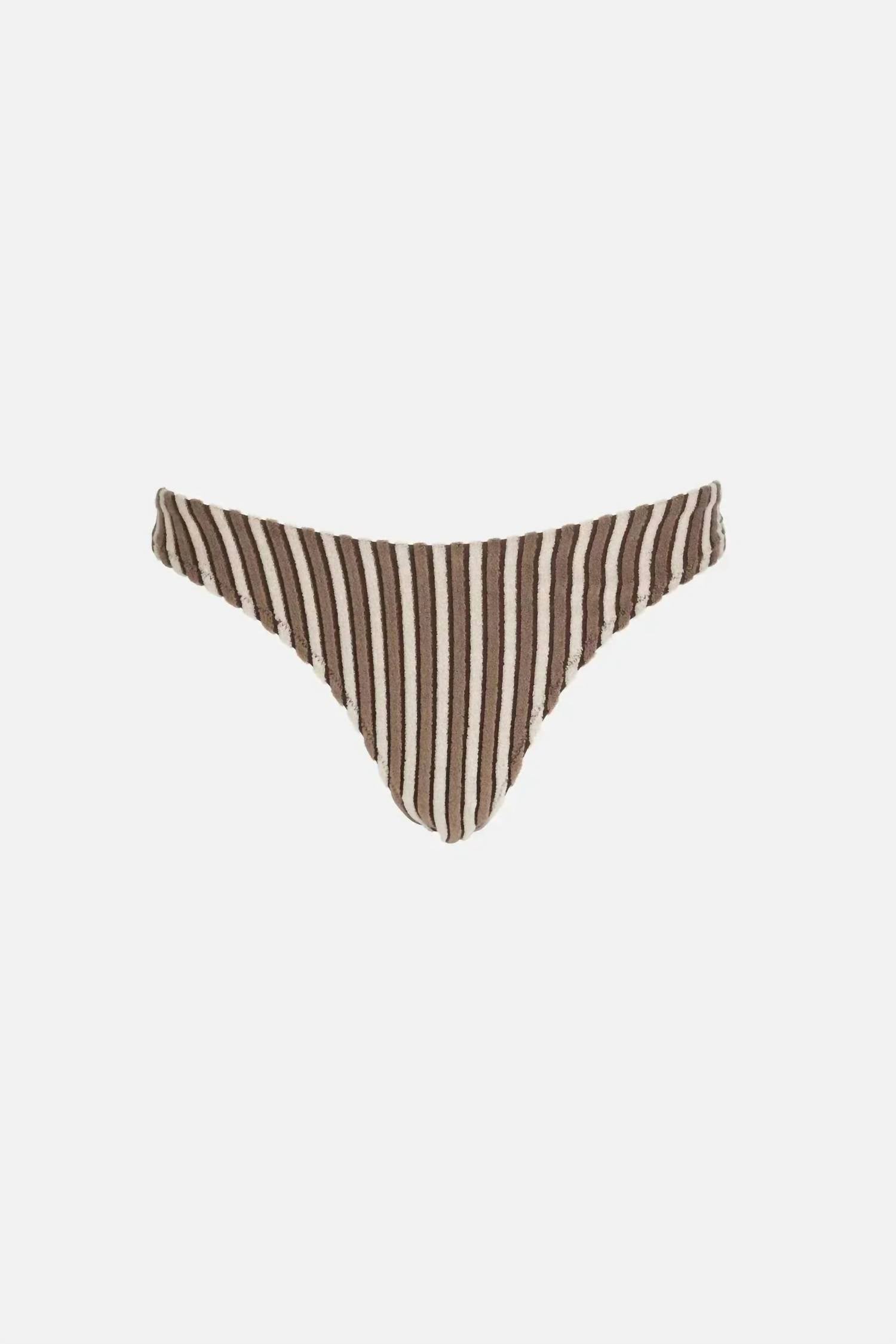 Introducing the Women's Terry High-cut Bikini Bottom by Rhythm, an elegant addition in a chic cocoa hue that effortlessly complements your summer beachwear. This mid-rise bikini bottom features a stripe pattern with an extra cheeky coverage to enhance your silhouette. Ideal for beach days and Valentine's Day getaways, this swim bottom celebrates coastal heritage while fitting comfortably on all body shapes. Care for this timeless piece by hand washing and laying flat to dry, ensuring long-lasting style and wear.